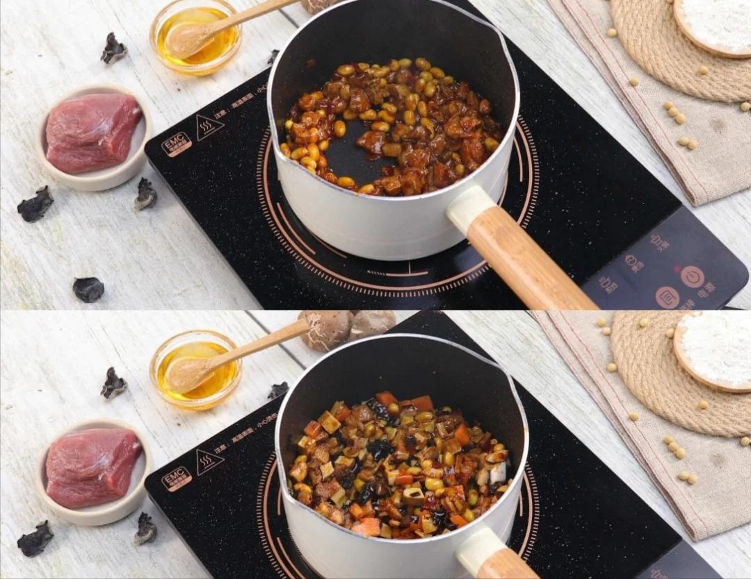 3、热锅倒油,倒入辣椒酱或者黄豆酱后,加入猪里脊丁炒至变色。加入切好的蔬菜丁继续翻炒,加入盐,生抽,辣椒酱继续翻炒后加入适量清水炖5分钟左右。