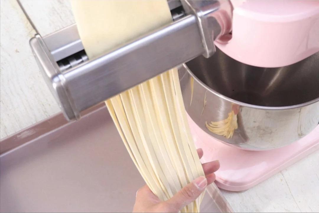 5、将松弛好的面团平均分成4个面剂子,压扁后使用厨师机压面配件选用2-3档位厚压成薄面片,换成粗面机压成面条即可。