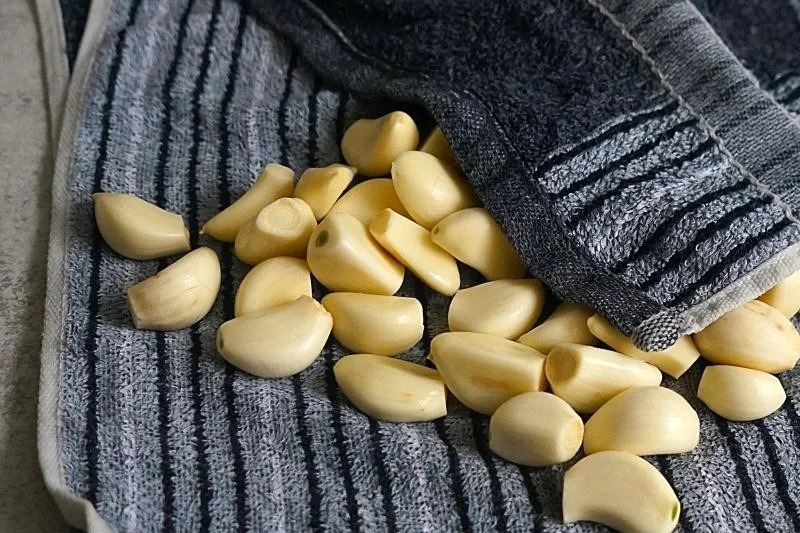2、剥完皮,把蒜头放凉开水里洗干净,再拿毛巾把水擦干。然后用刀把蒜头的底部和头部切掉,再拿牙签在蒜头上面扎几下,这样腌制的时候味道能更好地进去。