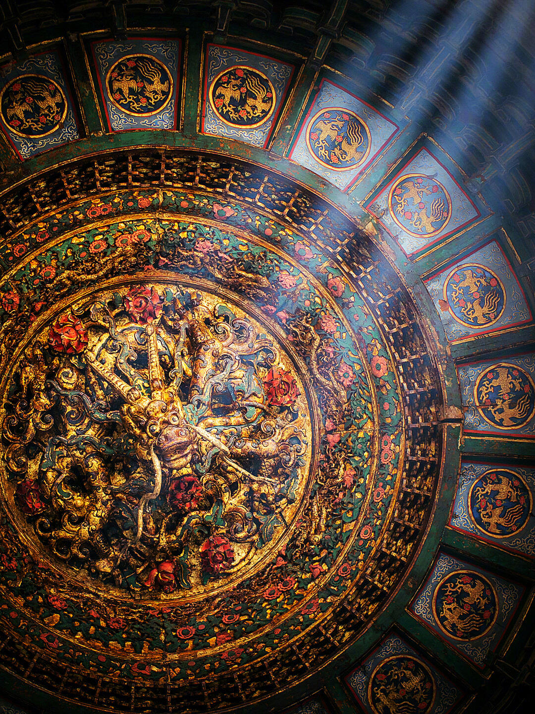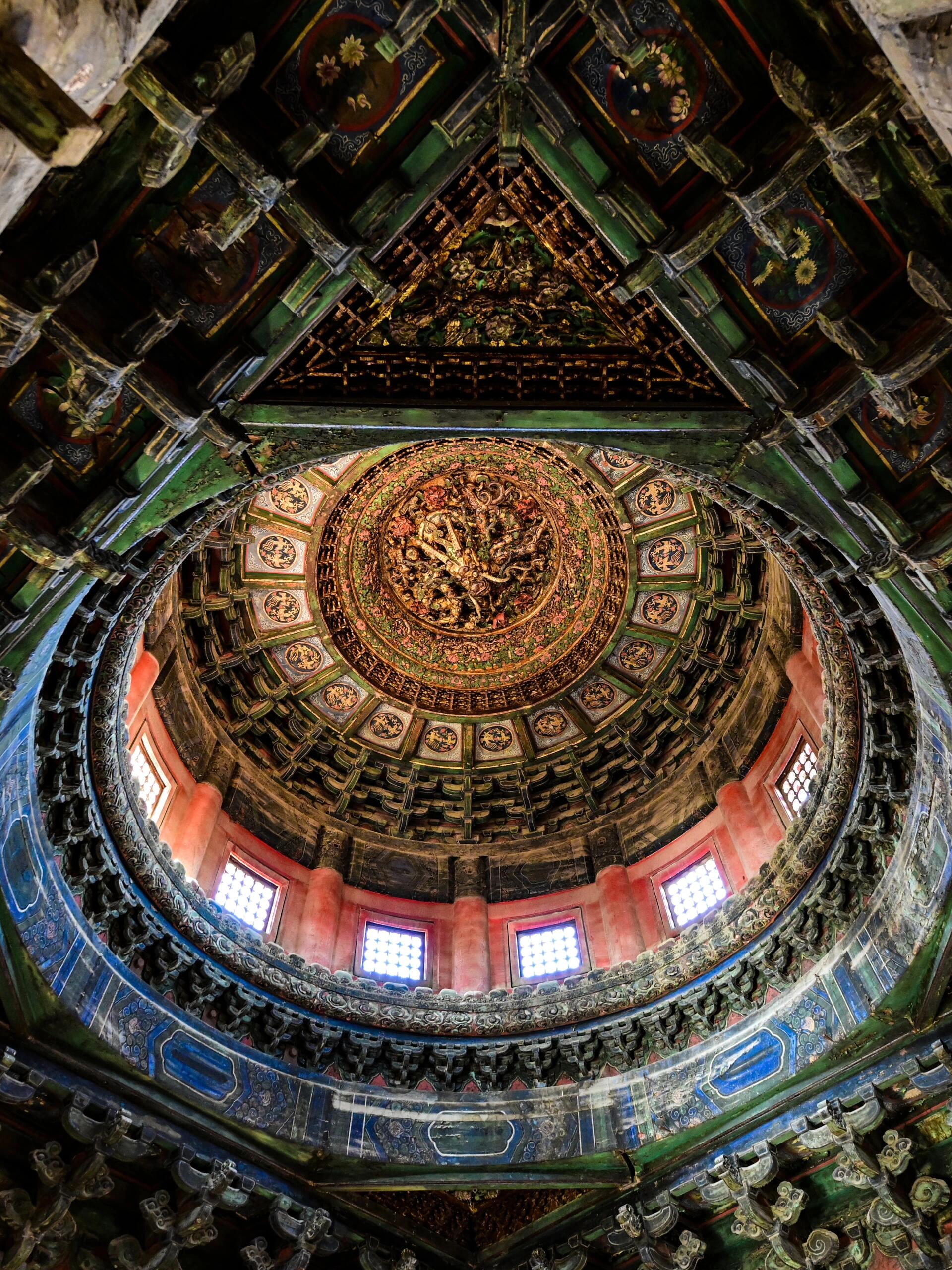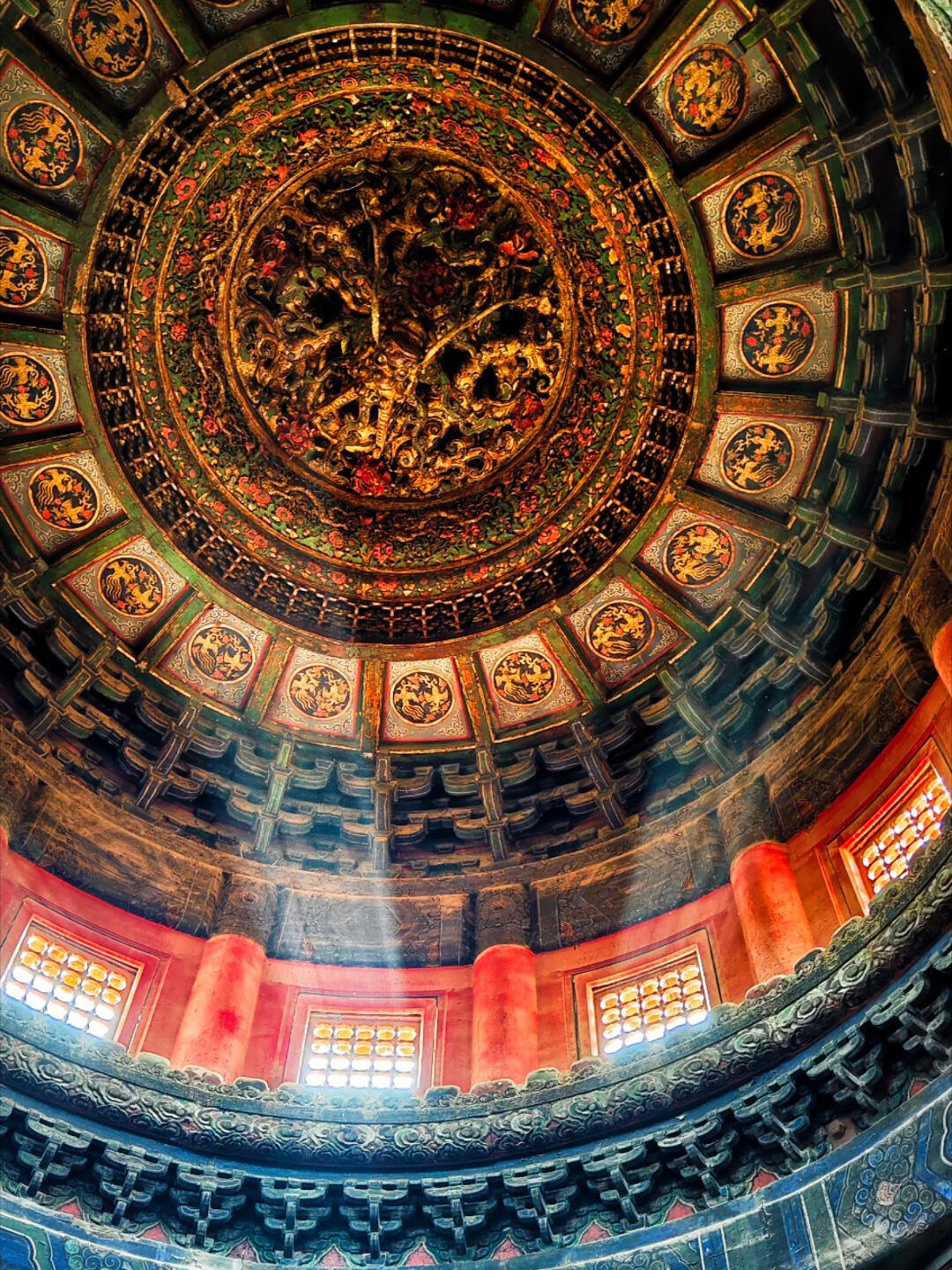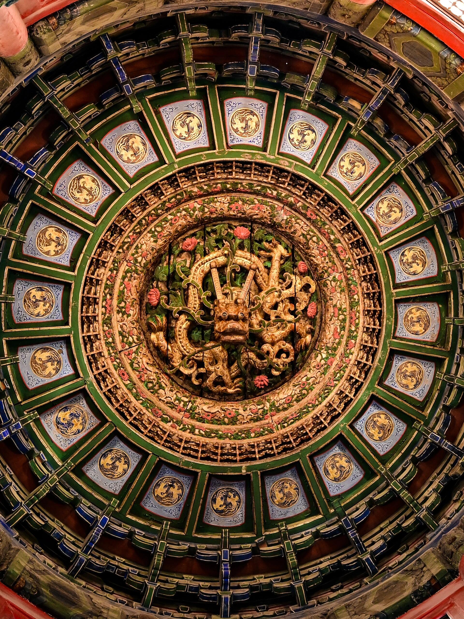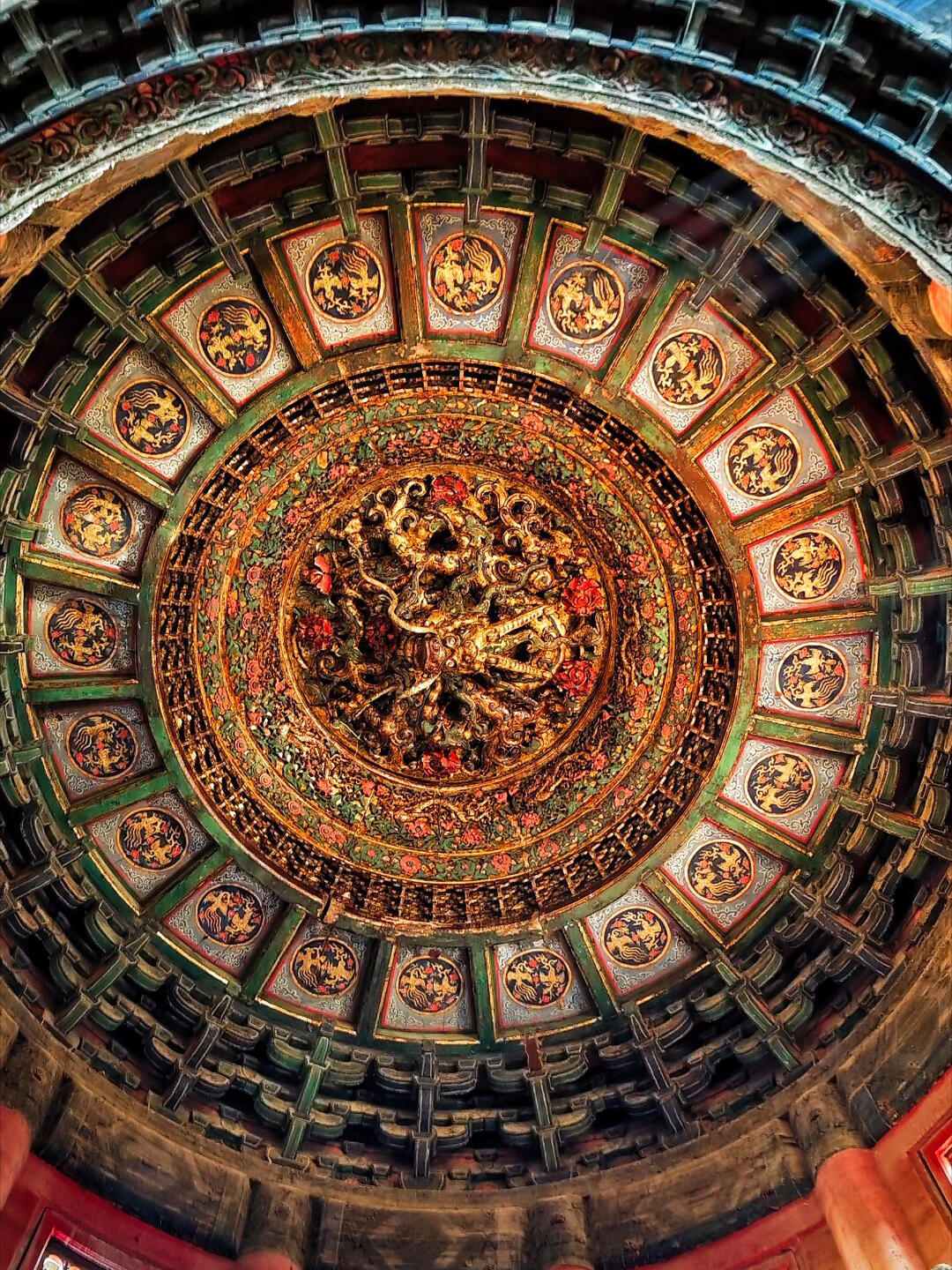 穿过御花园的紫藤架往万春亭走,远远就能看见亭顶的四角攒尖顶,青瓦上的吻兽翘着尾巴,可谁也想不到,最惊艳的风景藏在亭子里。推开斑驳的木门,先别急着看柱子上的楹联,顺着亭内的木梯往上走三步,再猛地抬头——整个人会瞬间被那方藻井“吸”进去。下层的斗拱像绽放的莲花瓣,每片“花瓣”都是由三个小斗拱拼成,斗与拱的衔接处刻着卷草纹,纹路细得能放进指甲盖,却没有一处断裂。往上看,斗拱一层比一层小,到第七层时开始螺旋向上,形成一个通向顶端的“天井”,阳光从亭顶的小窗漏进来,正好照在中央的盘龙身上,龙鳞上的金粉在光里浮动,像真的有龙在云里游动。