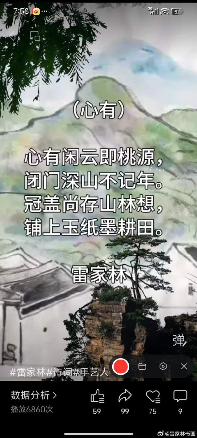 结语:隐逸书写的当代价值此诗以二十八字构筑精神桃源,既承续了“采菊东篱”的古典基因,又以“墨耕田”的创新隐喻,为现代人提供了心灵自救的路径——在喧嚣中以艺术耕耘守护内在秩序。正如雷家林所言:“心有闲云即桃源”,真正的归隐是灵魂的自由赋形。