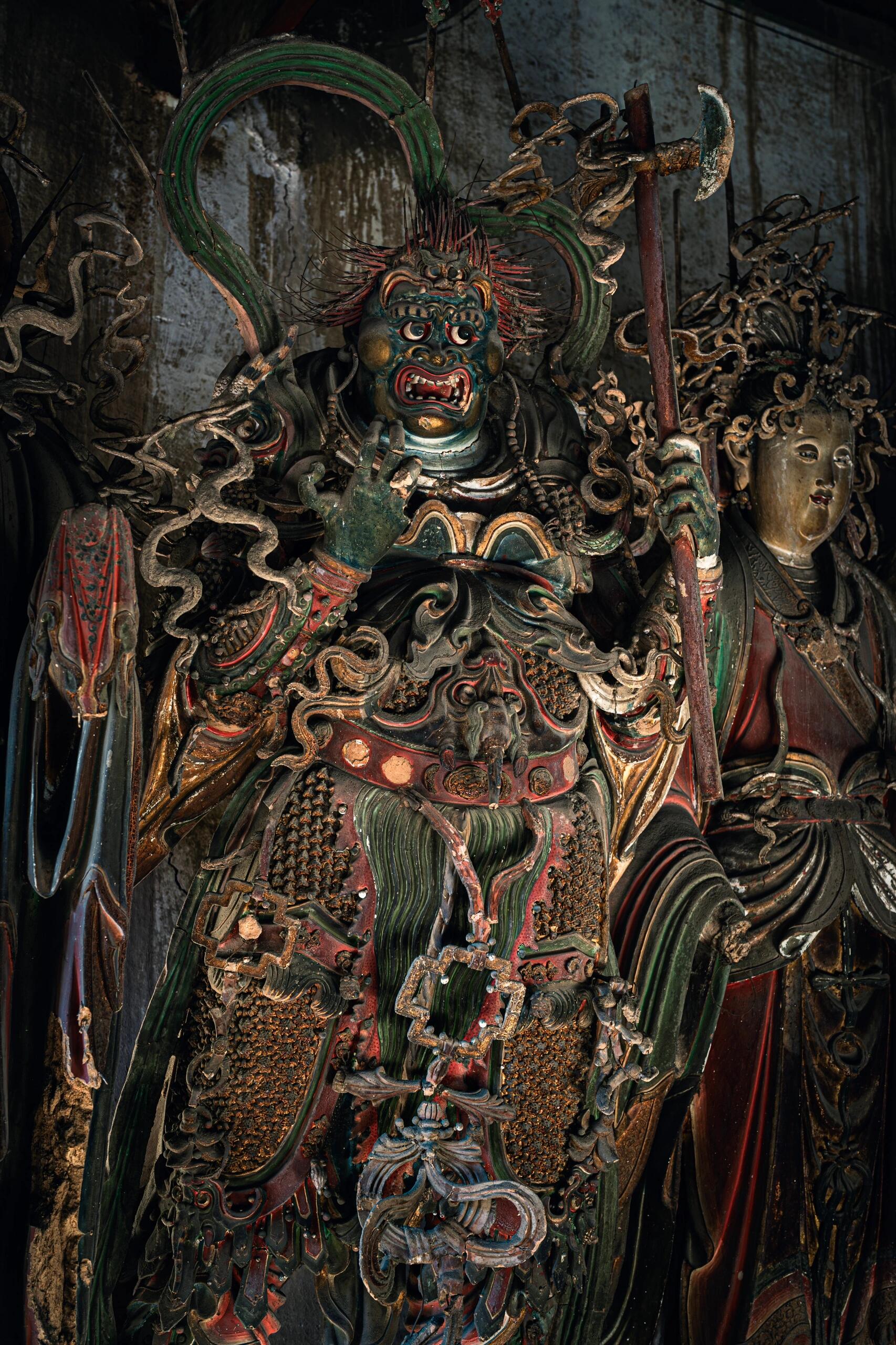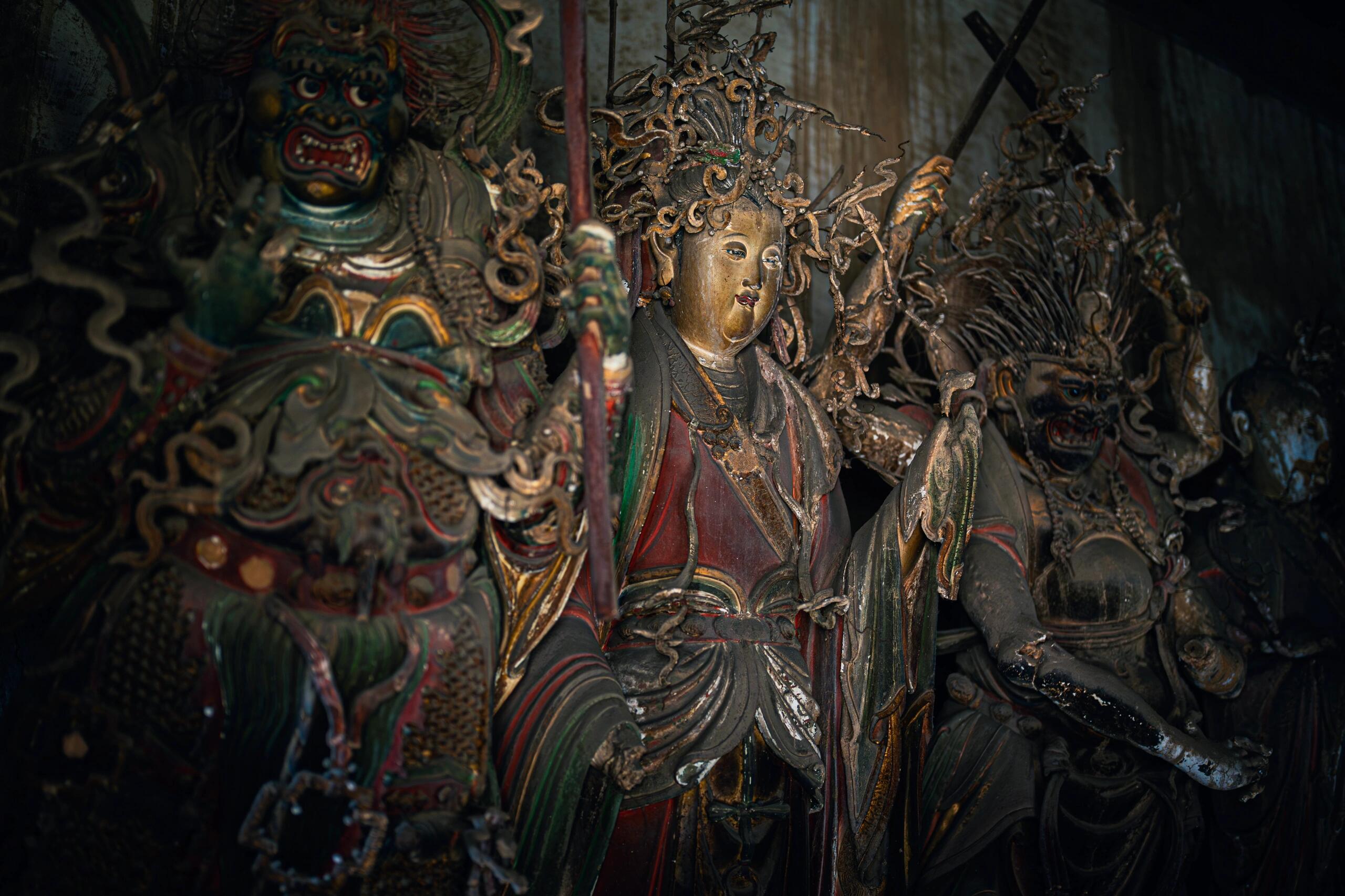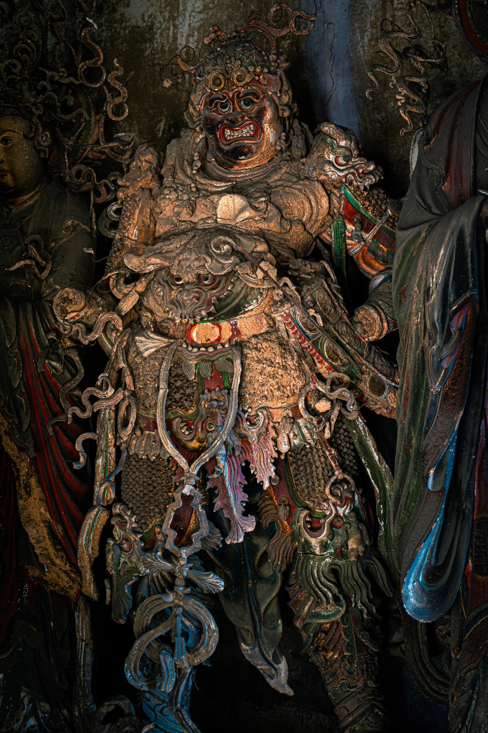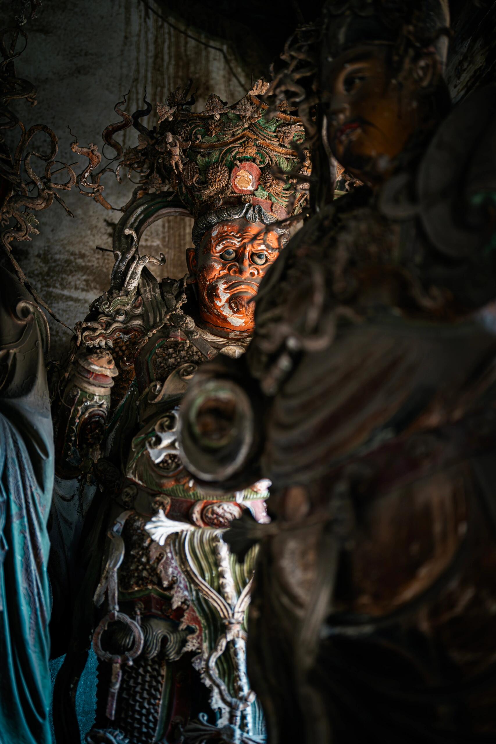 光线暗得厉害,后墙的窗棂糊着纸,破了好几个洞,阳光漏进来,在塑像身上投下细碎的光斑。老李说这光得赶在晌午看,那会儿光斑正好落在中间那尊天神的眉心,像点了颗朱砂。有回一个摄影师蹲在走道里等了三天,才拍成那张照片,现在放大了挂在寺门口,倒比"铁佛寺"的牌子还显眼。