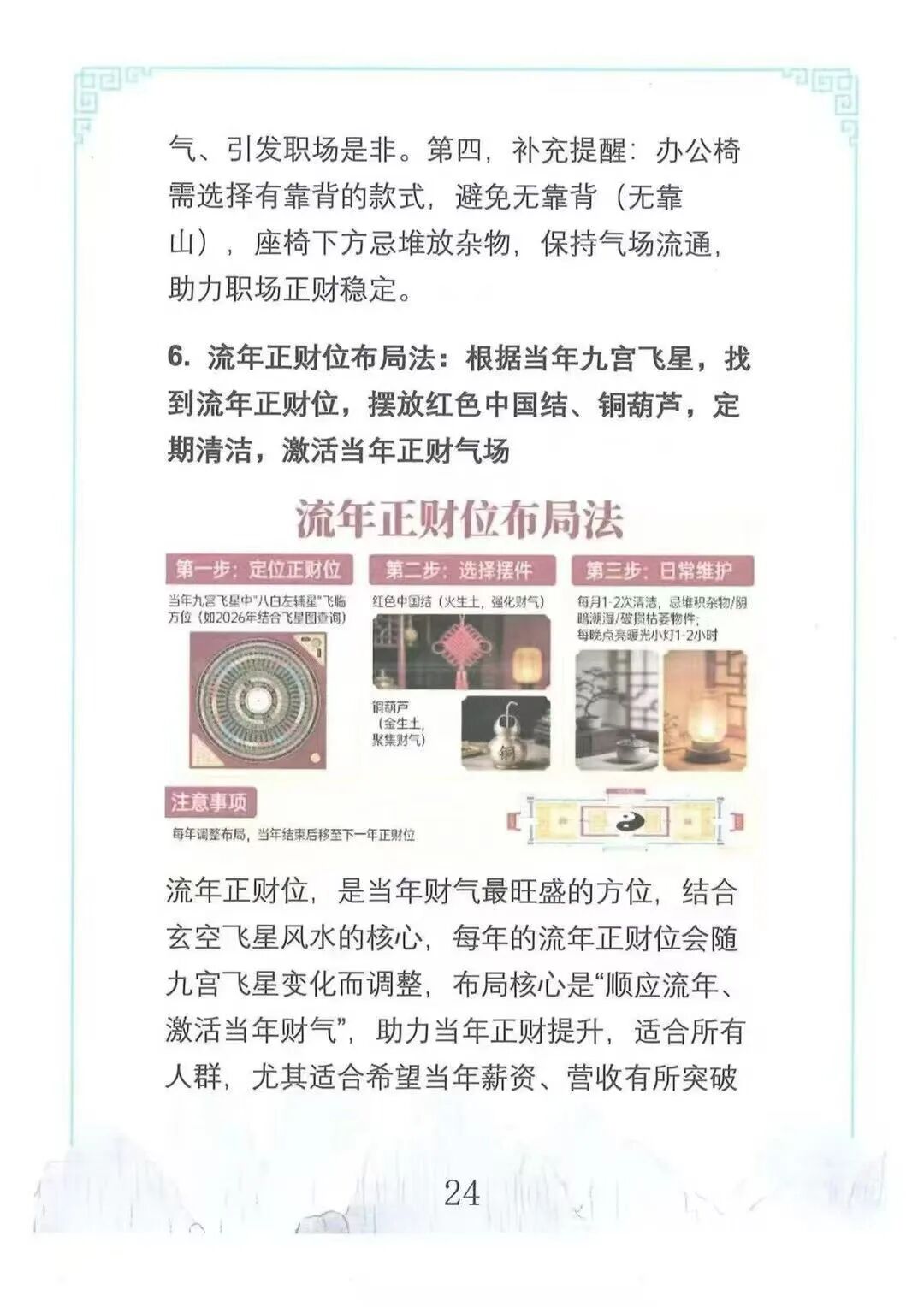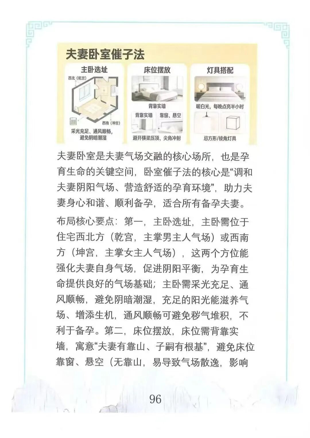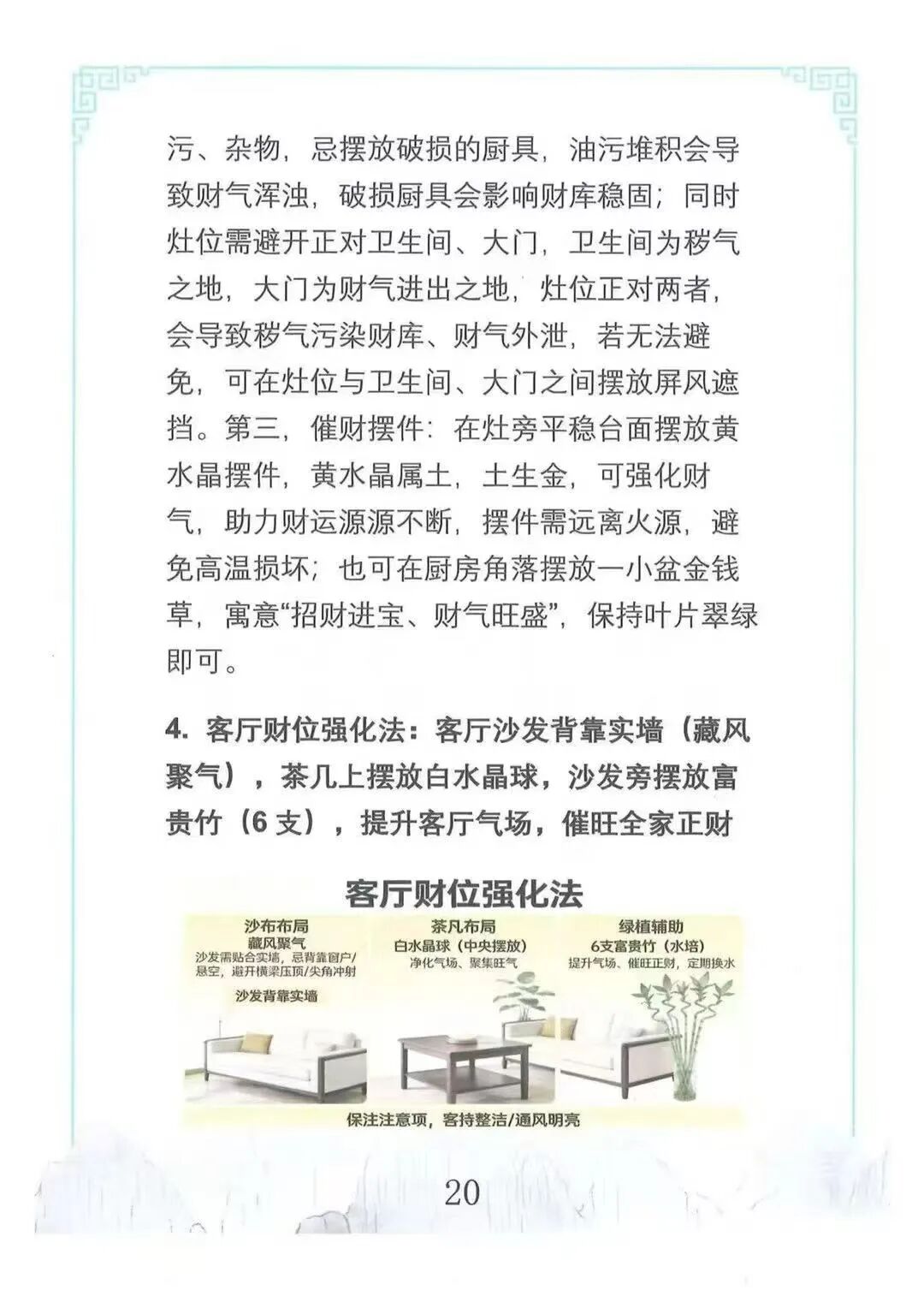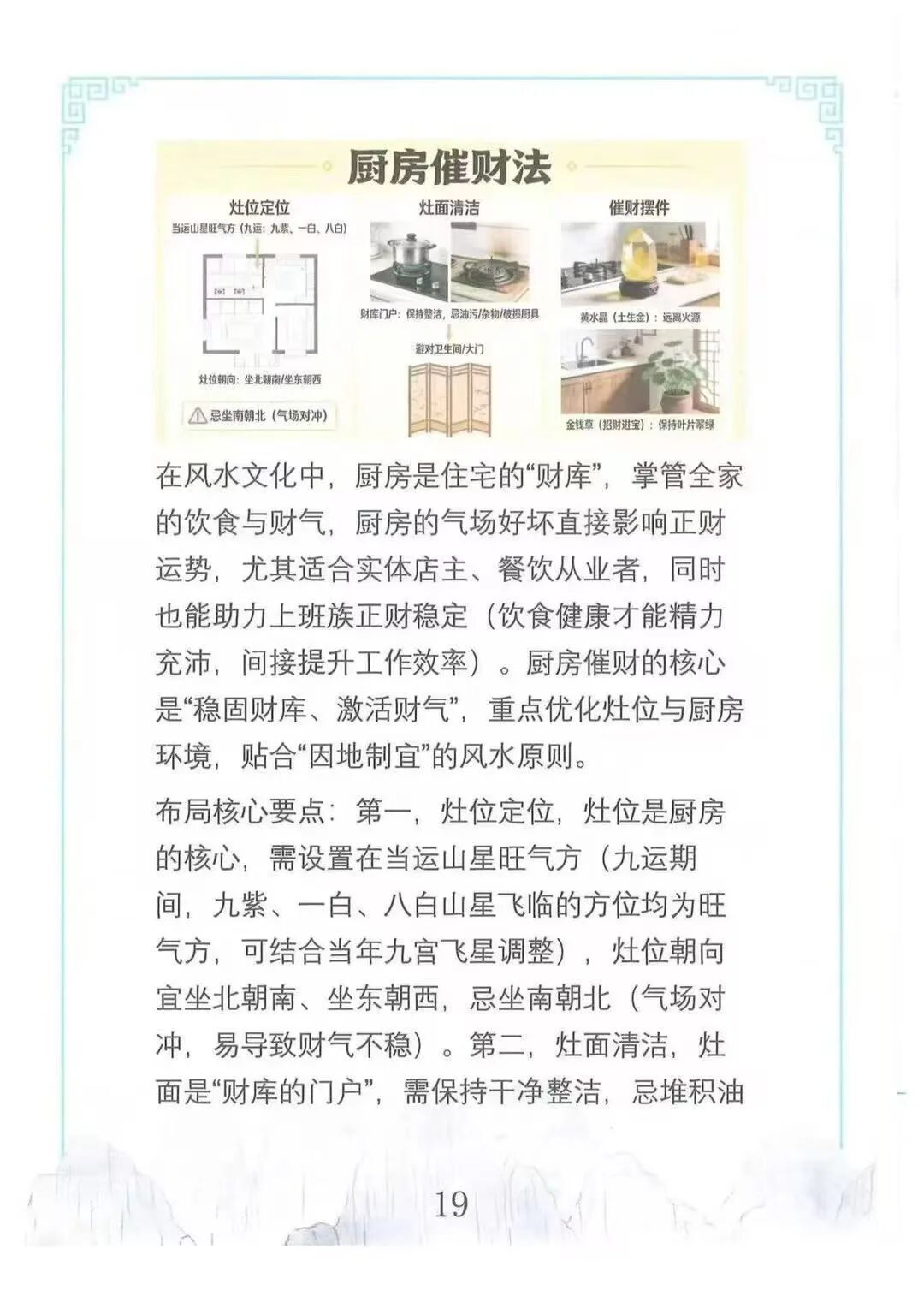 :分章细述 ** 客厅(财位 / 沙发 / 电视墙)、卧室(床位 / 衣柜 / 梳妆台)、厨房(炉灶 / 水槽 / 冰箱)、卫生间(马桶 / 浴室 / 排气)、书房(书桌 / 书架 / 文昌位)、阳台(绿植 / 水池 / 休闲区)** 的风水禁忌与吉局布置,图文对照、直接套用。