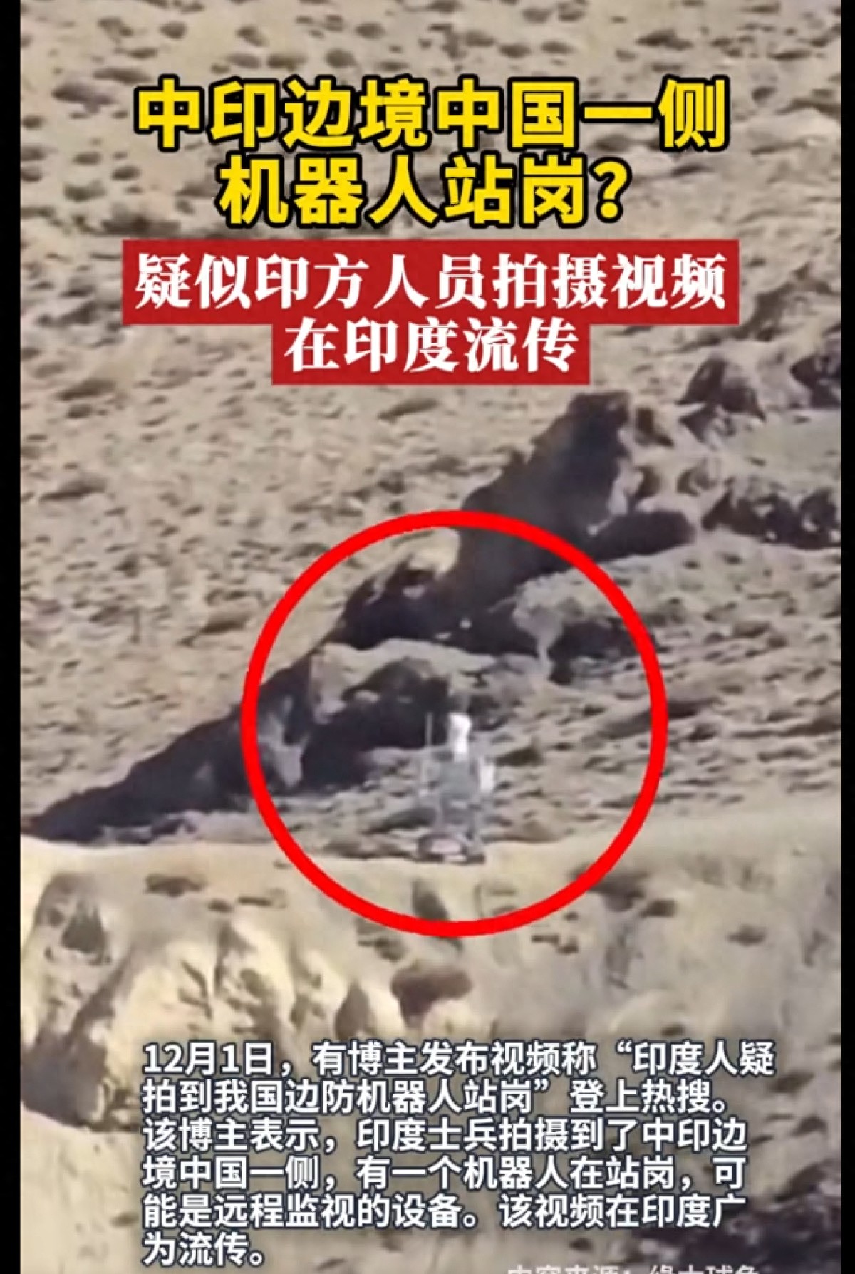该博主表示,印度士兵拍摄到了中印边境中国一侧,有一个机器人在站岗,可能是远程监视的设备。据悉,该视频在印度广为流传。