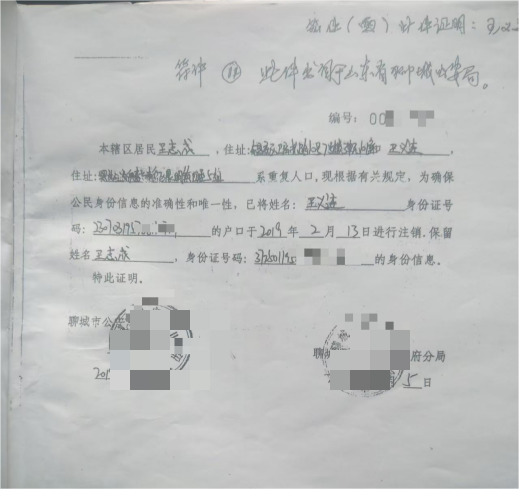 1978年,因头部外伤后遗症影响,王志成无法正常工作,没有稳定生活来源,不得不离开黑龙江南岔,回到山东聊城市东昌府区投靠爷爷奶奶,这一待就是47年。聊城市公安单位出具的户籍材料清晰佐证了他的经历:依据公安部相关规定,因王志成在聊城连续生活二十余年,早已落实当地户口,其常住人口登记卡明确记载住址为山东省聊城市东昌府区。
