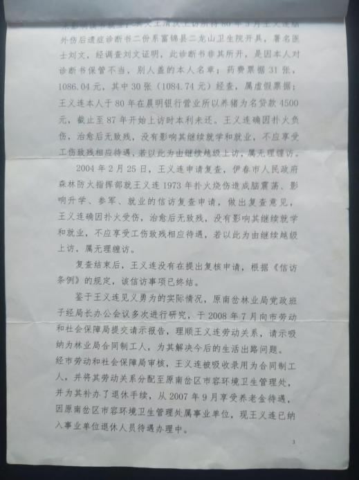 2019年11月4日,王志成正式向南岔县相关部门提出信访诉求,要求依据《工伤保险条例》申请赔偿,索赔四十六年误工费230万元、护理费与交通费300万元、精神损失费与交通费192万元、1973年治疗费100万元,合计约822万元。2020年11月3日,南岔县相关单位出具《关于王志成信访诉求事项的处理意见书》,以"身份信息不符"(档案中王义连身份证号前6位为230703,与王志成不符)为由驳回诉求,且该意见书的送达记录存在送达人信息模糊、时间填写错误、未实际签收等诸多瑕疵。