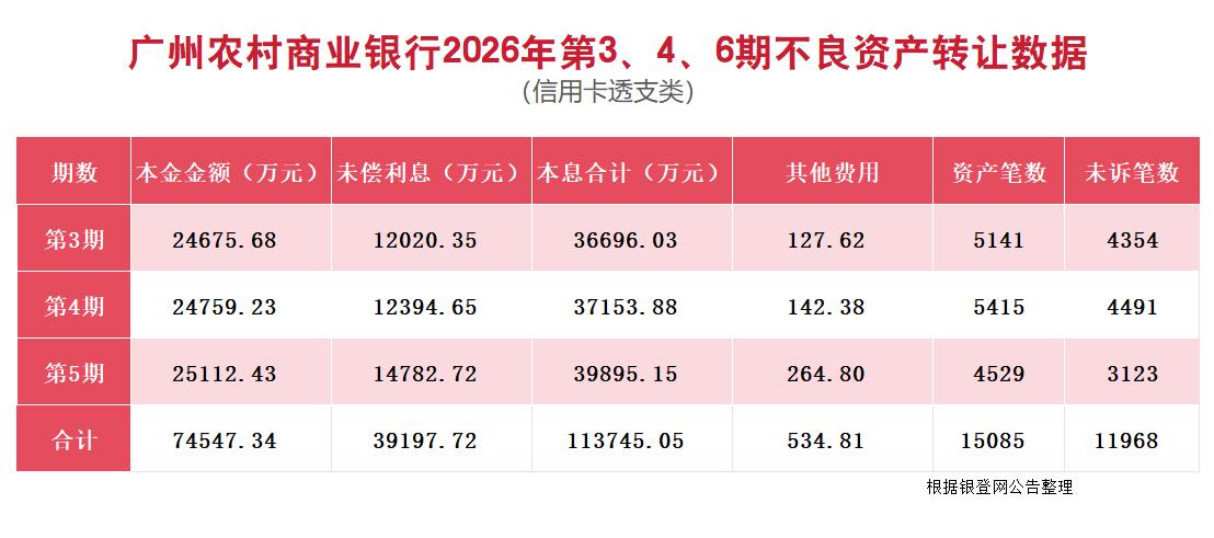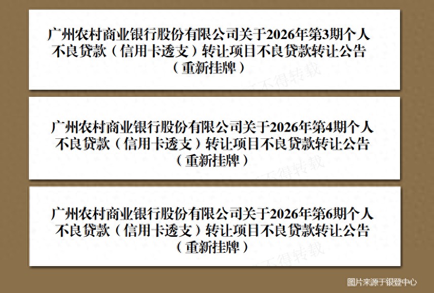 4月20日,银登网刊登了3则个人不良资产转让公告,均为广州农商行的资产包,产品类型是信用卡透支类,债权本息金额超过11亿元。