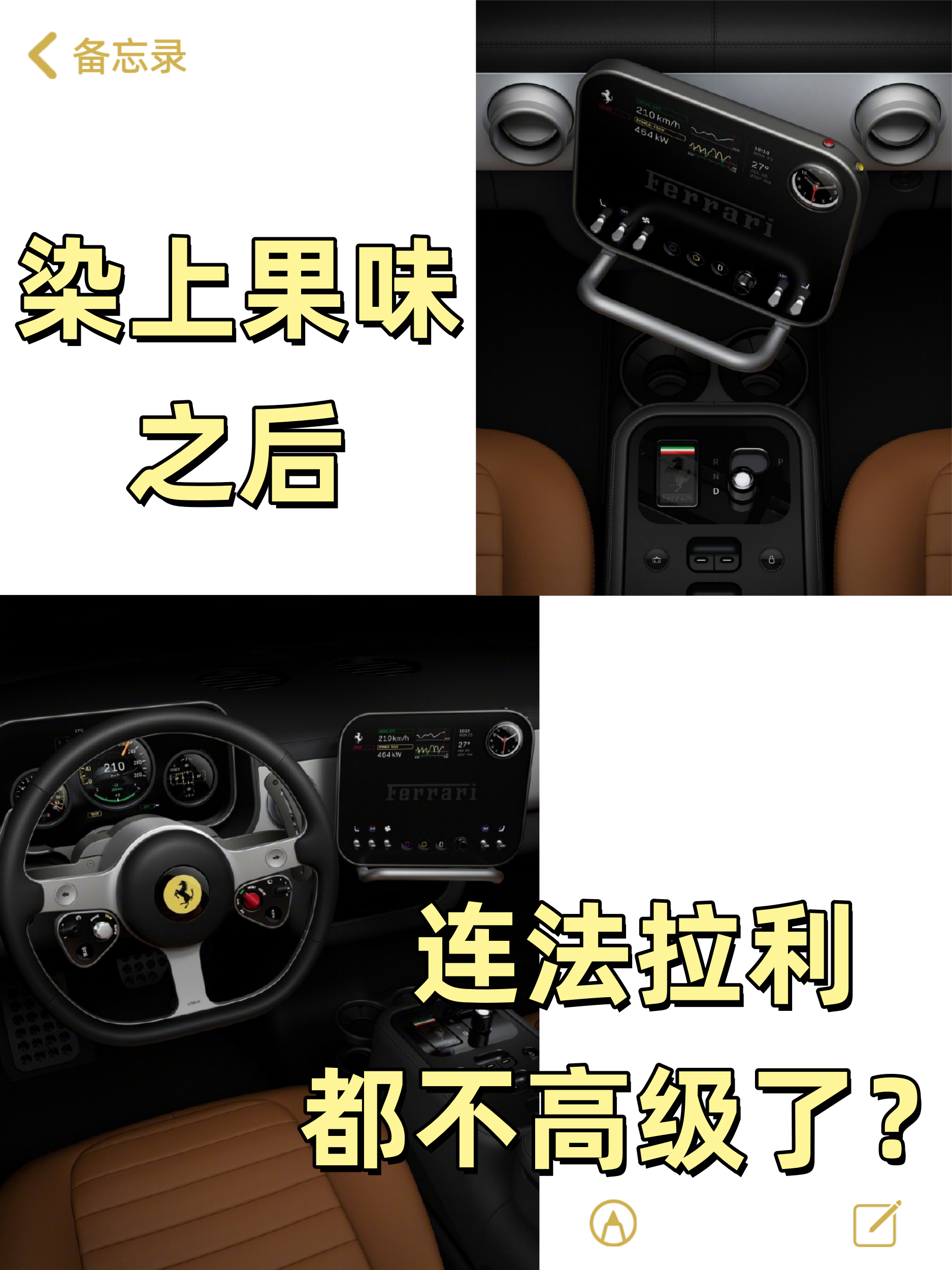 这年头连法拉利都开始做电车了,还拉了前苹果设计师安排上了一套内饰,一眼过去只能说果味太足了,反而没了法拉利的高级感!之前看到“法拉利老了还是法拉利”这句话在刷屏的时候还在感慨,老牌就是保障,结果转眼一染上果味就让人眉头一皱了。