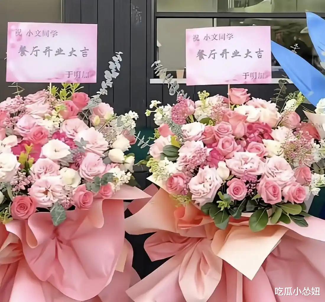 因为新店开业,门口摆了一排花篮。花篮虽然不少,但仔细一看会发现一个扎心的现实:整个娱乐圈,只有一个叫于明加的署名花篮。