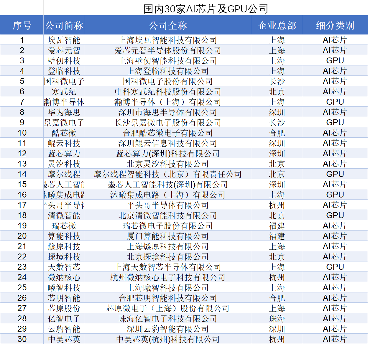 深芯盟报告显示,国内现有74家国产芯片和处理器厂商,涵盖AI芯片、CPU、视频处理器、GPU等8个类别,其中涉及AI芯片和GPU的厂商共30家。