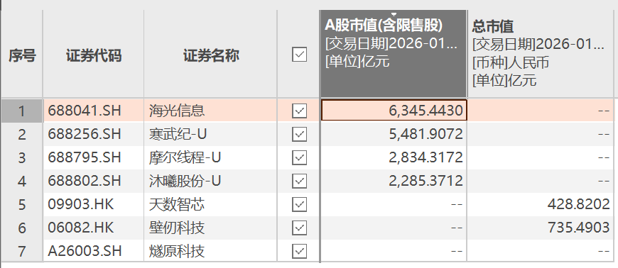 截至1月26日收盘,A股的海光信息、寒武纪、摩尔线程、沐曦股份市值分别约6340亿元、5480亿元、2830亿元和2280亿元;港股的壁仞科技、天数智芯市值分别约735亿元和430亿元,与A股头部企业存在明显差距。