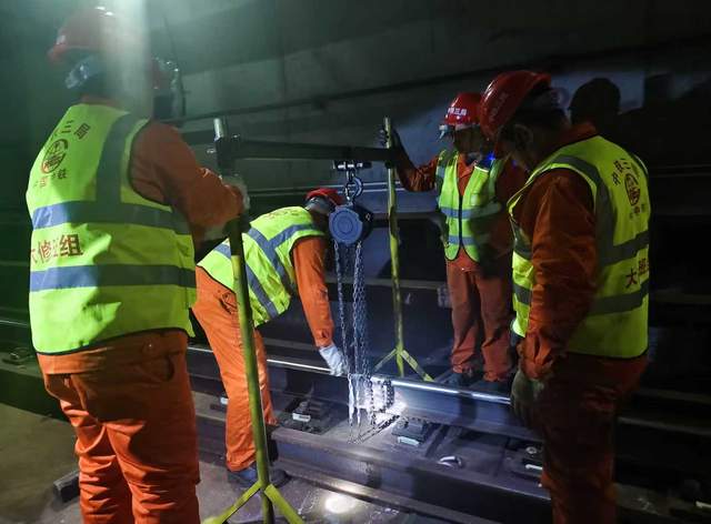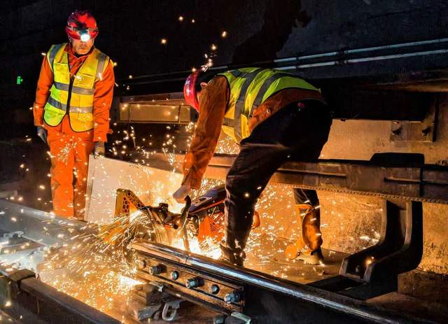 此次钢轨大修聚焦地下小半径曲线施工难点,施工区间隧道曲线半径仅350米,换轨总长度650米,利用两个“天窗点”分别完成300米和350米长钢轨更换。施工涵盖旧轨拆除、新轨铺设、铝热焊接、轨道精调等多道工序,涉及线路、信号、接触轨等多专业协同,对钢轨精准入槽、既有设备保护等提出极高要求。