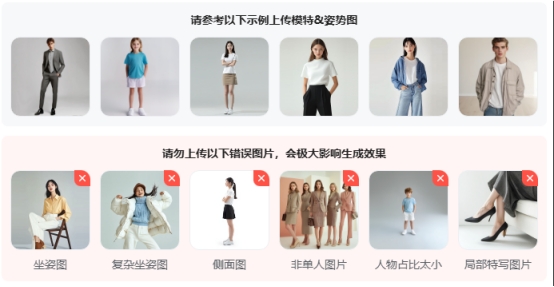 如果你对预设模特不满意,还可以选择自定义模特,上传自己的真人模特照片,让AI将新服装换到自己的模特身上。