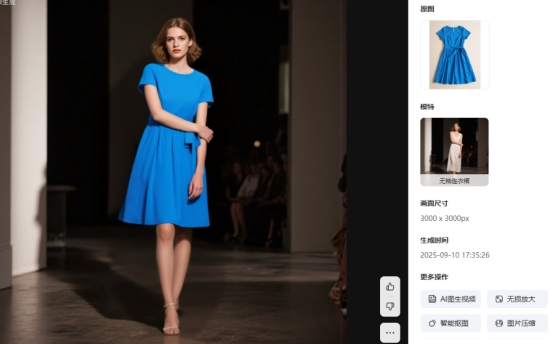 最后点击立即生成,系统会智能识别服装的材质、纹理、褶皱等,然后将其自然地贴合到模特身上,生成的图片效果堪比实拍,直接使用也不是问题。