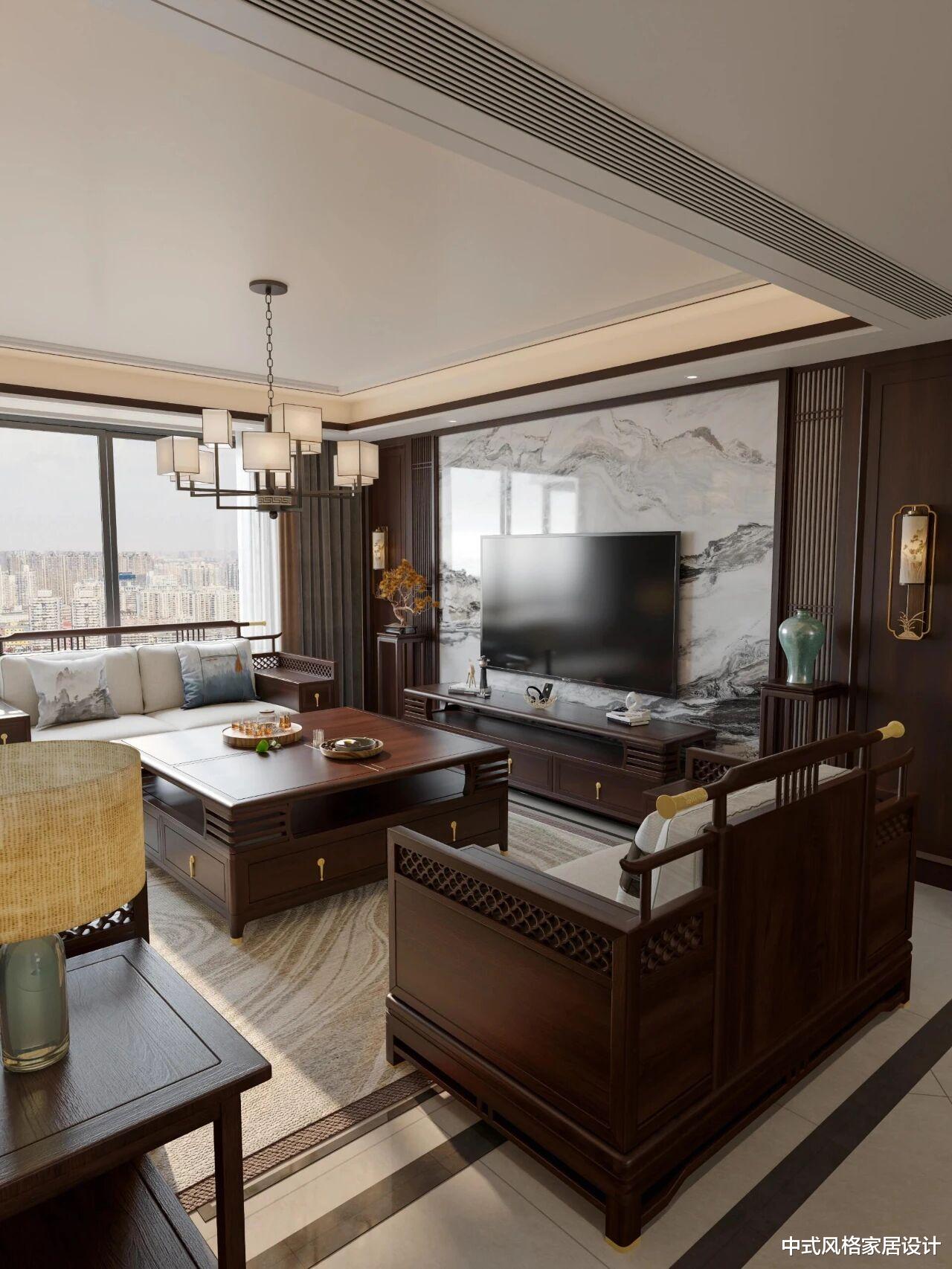 以沉稳的深色实木家具为基调,融合现代简约与东方传统美学。电视墙采用大理石材质,两侧对称摆放青瓷花瓶与盆景摆件,上方山水纹装饰画增添自然意境。深色实木沙发线条流畅,搭配浅灰色布艺靠垫,与同系列茶几、单人椅形成和谐呼应。中式吊灯悬挂于上方,暖黄色灯光透过玻璃罩洒落,与窗外城市景观形成虚实对比。地面铺设浅灰色地毯,边缘几何纹路与整体色调统一,营造出低调高贵、宁静舒适的东方居住氛围。
