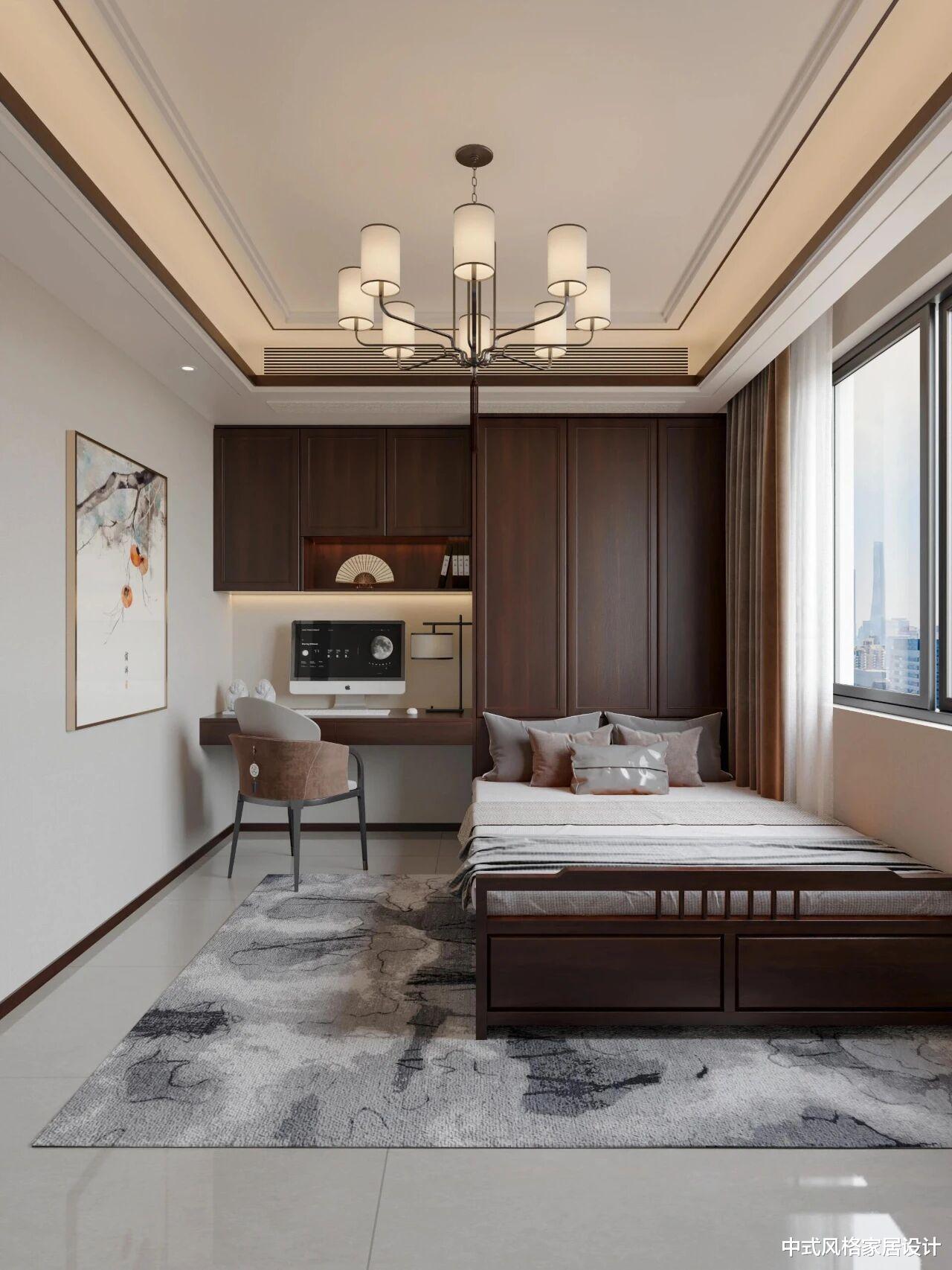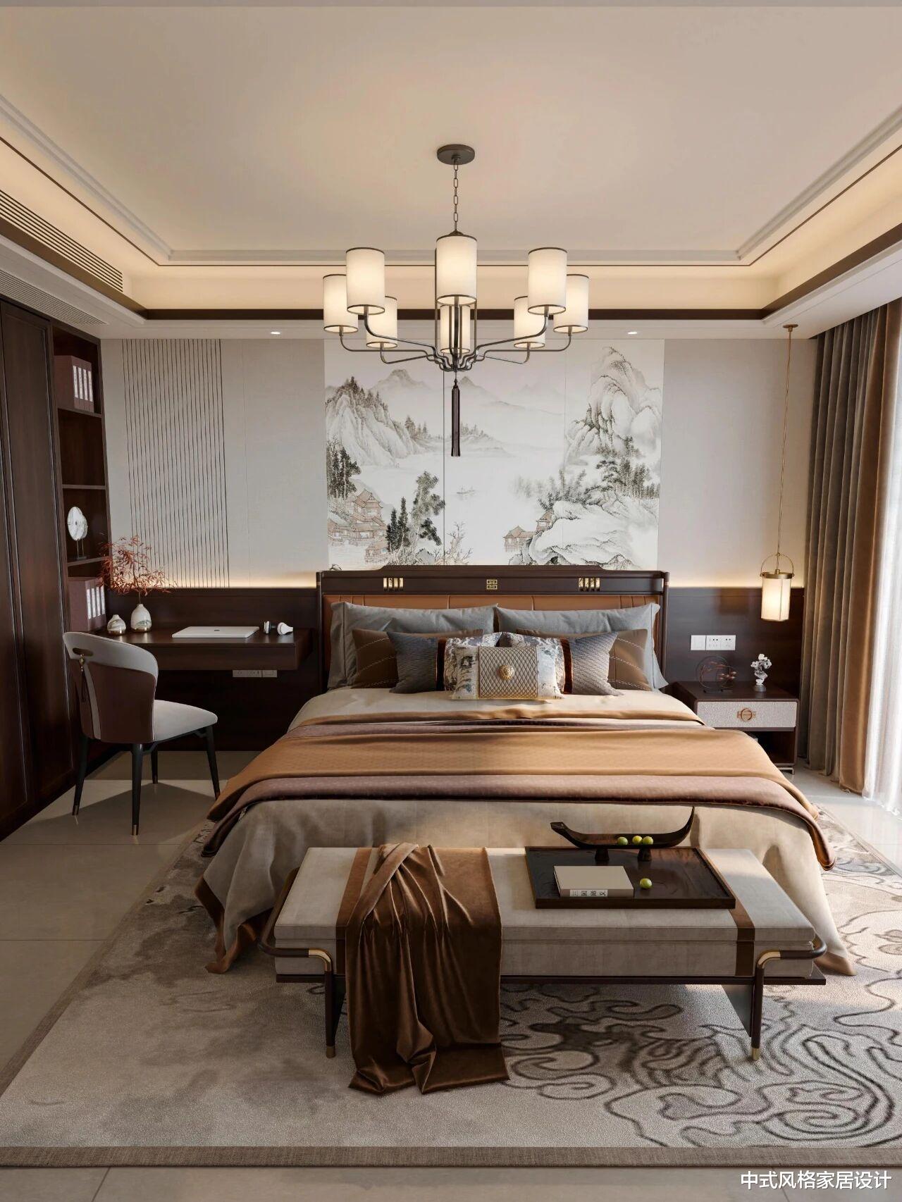 主卧室,整体以深棕与米白为主色调,营造出沉稳雅致的氛围。床头背景墙悬挂着一幅水墨山水画,远山淡影与近树苍劲相映,为空间注入东方意境。床头柜与书桌采用深色实木材质,线条简洁利落,搭配金属质感的吊灯与床头壁灯,平衡了传统与现代的质感。床榻铺陈米色与棕色交织的软包靠垫,床尾处的长凳上搭着同色系丝绒毯,细节处尽显温润。地面铺着带有云纹暗纹的浅色地毯,与窗外透入的自然光共同柔化了空间棱角,展现出新中式风格“以古为鉴,以今为用”的设计精髓。