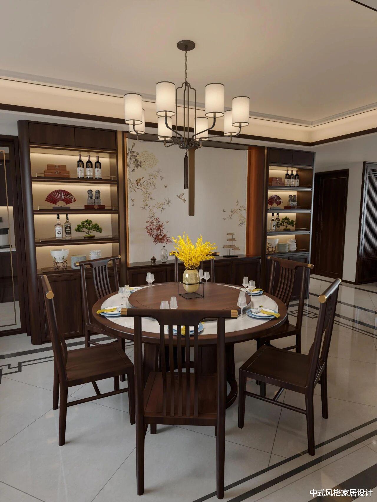 中央摆放着圆形实木餐桌,搭配同色系餐椅,桌面铺浅色台面,摆放着精致餐具与一束明黄色插花,增添生机。餐桌上方悬挂着一盏多灯头吊灯,金属支架与米白色灯罩相映,光影柔和。背景墙以水墨花卉装饰画为视觉焦点,两侧对称分布嵌入式酒柜,内藏酒瓶与餐具,兼具收纳与展示功能。地面铺设浅灰色大理石地砖,边缘以黑色线条勾勒,细节处尽显中式美学的沉稳与现代设计的简约。