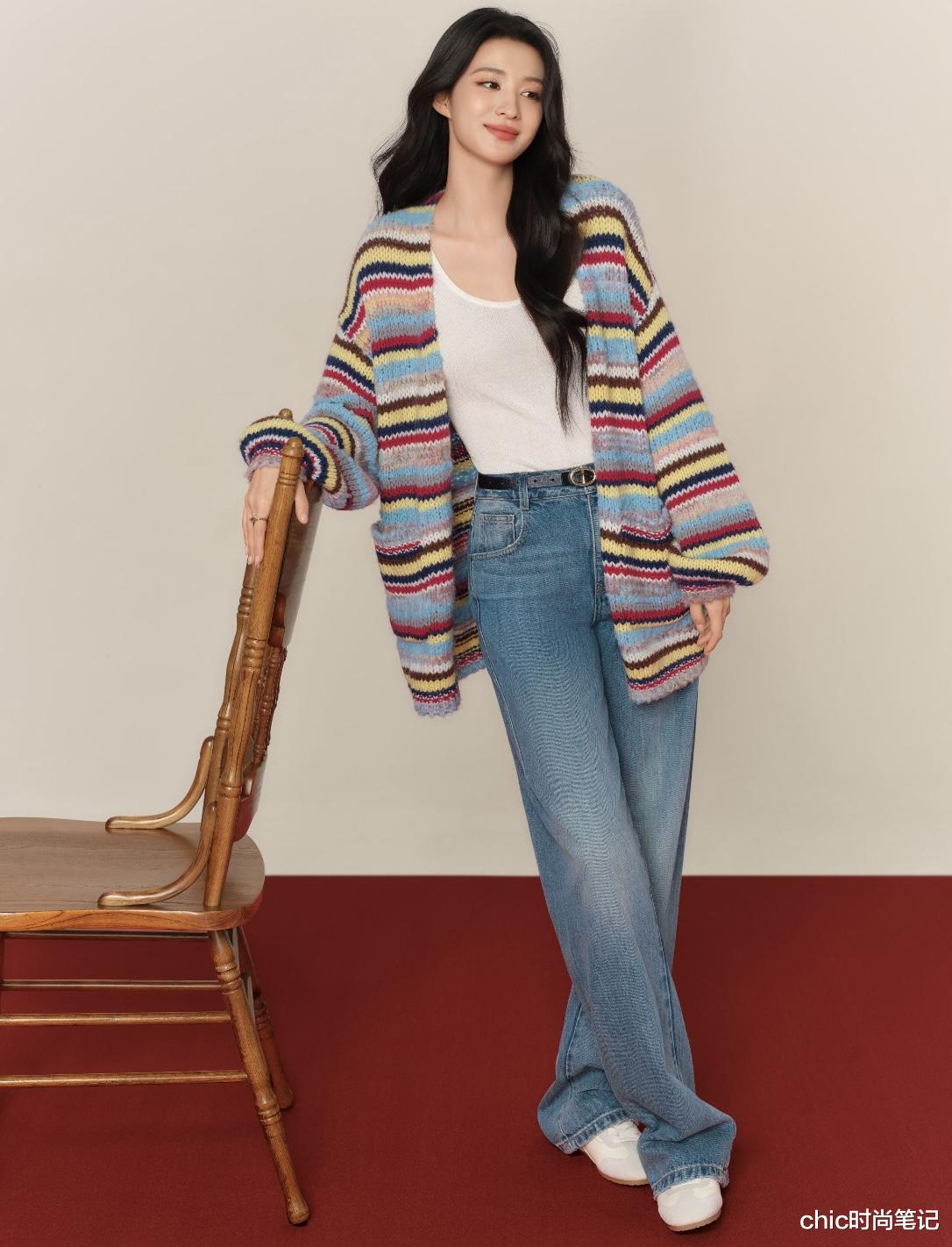 白色T恤搭配彩色条纹毛衣开衫和做旧款牛仔裤,很松弛感的一套风格,把随性和活力轻松展现出来。