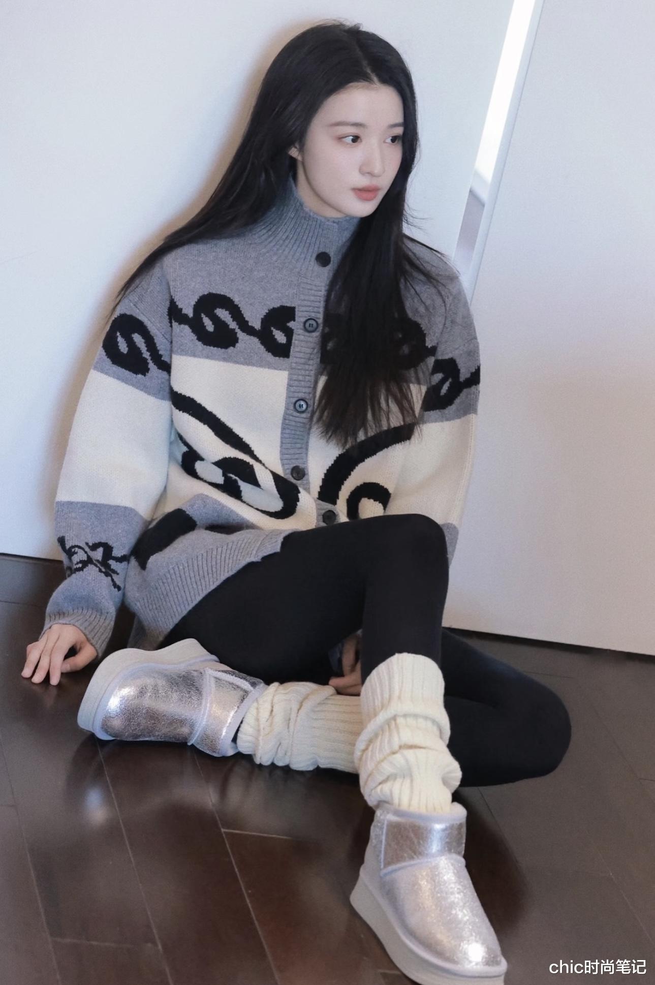 拼接涂鸦毛衣做了宽松、大版的设计,搭配打底裤和堆堆袜,今年非常流行的一套穿搭法,层次与时尚完美融合。