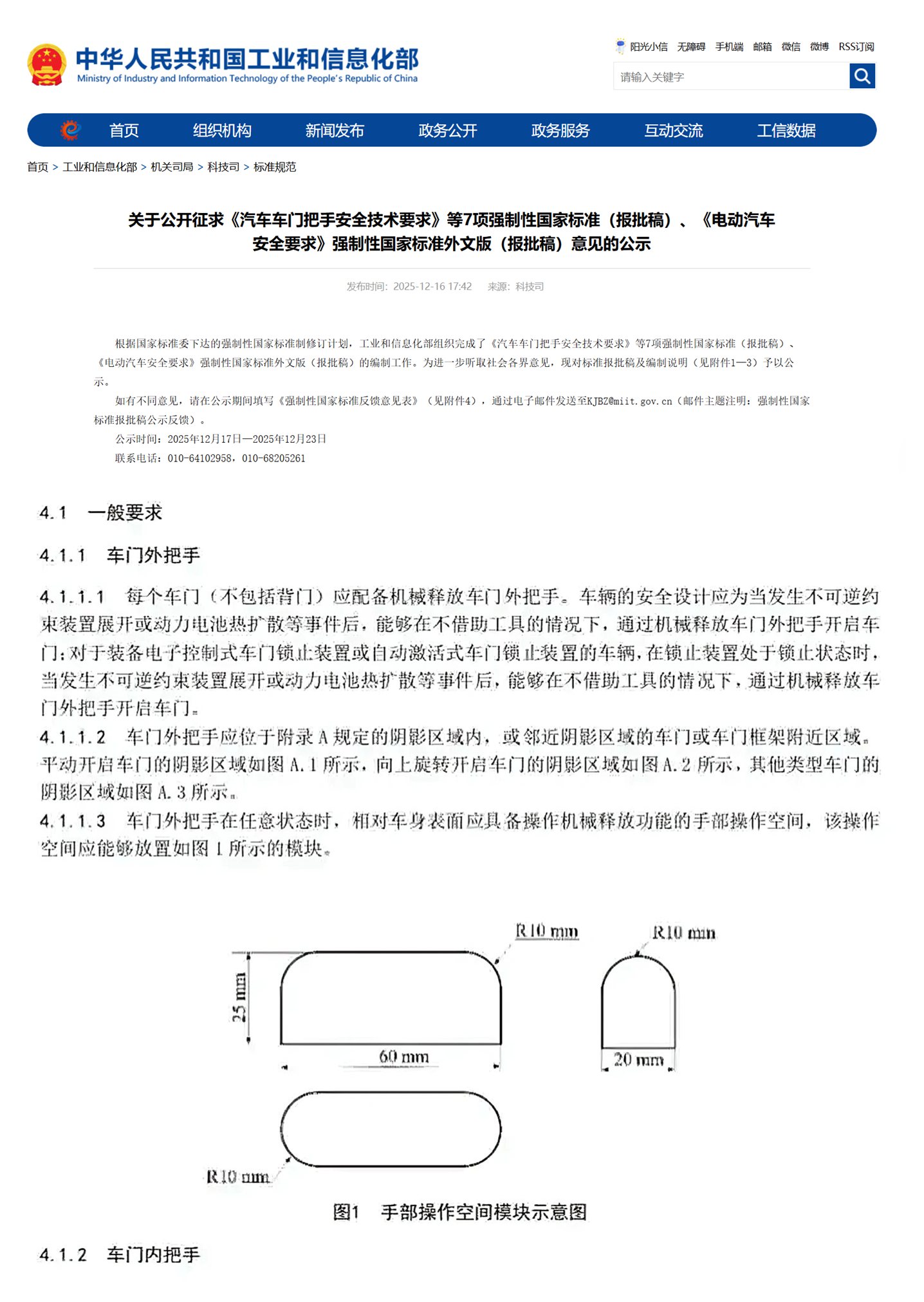 二、中国新规:从 “禁止隐藏” 到 “强制机械”,分阶段筑牢安全底线为解决上述隐患,工信部《汽车车门把手安全技术要求》(2027 年实施)围绕 “机械冗余” 和 “可及性” 制定严格标准,彻底终结全隐藏式把手的设计潮流: