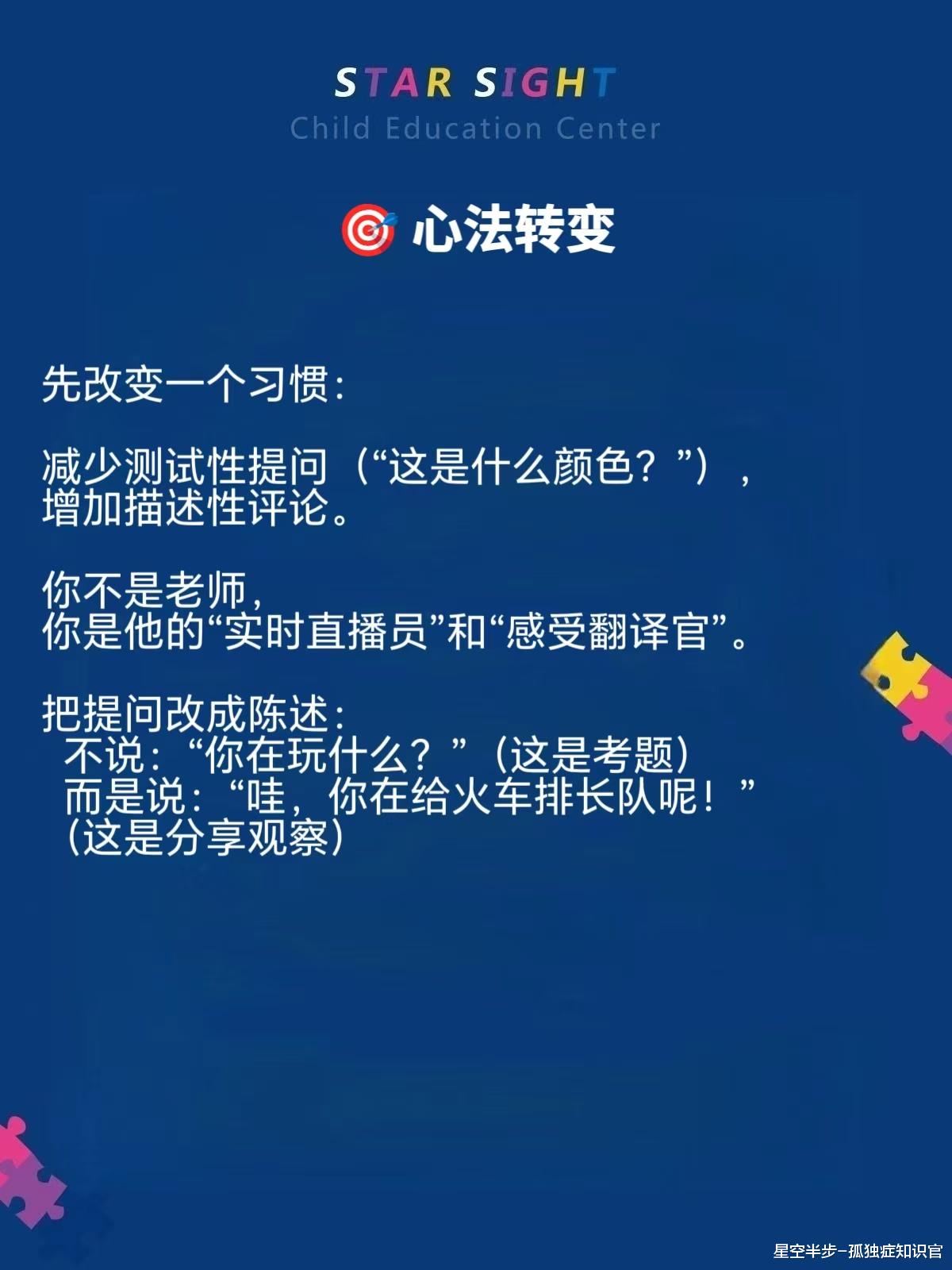 今天分享亲测有效的自闭症孩子 “聊天三步阶梯” 。核心心法是:真正的聊天不是“考问”,而是“分享”。 我们从考官,变成孩子快乐的分享对象。