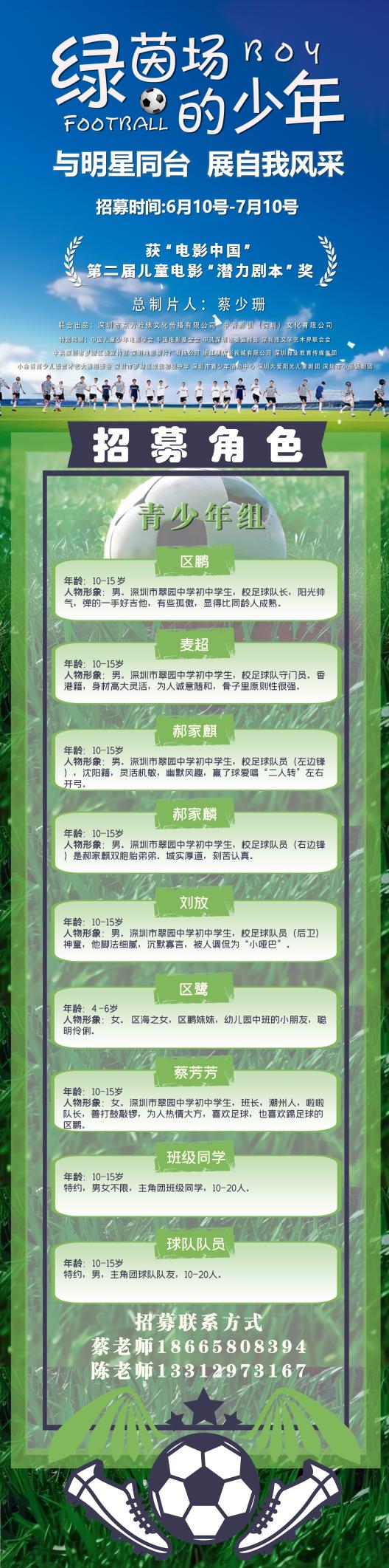院线电影《绿茵场的少年》演员海选自6月10日起为期一个月,最终将选拔出20-30名孩子接受专业系统的培训后在电影里出演各种角色,计划将于8、9月份拍摄完成,能够作为演员参与到电影的拍摄将会获得专业影视导演对孩子的调教与指导(实操),参加电影所有流程活动包含新闻发布会、开机仪式、杀青仪式、首映礼,参加各相关电影节(走红地毯),专业的定型/剧照拍摄,电影宣传演员部分的推广,集体工作生活的经历,所拍摄的电影将在院线、电视台、网络等所有视频类播放平台播出并在国家电影局留档保存,参与电影拍摄的相关影像记录,向专业/知名演员学习表演技巧,拥有自己的影视作品。“真正的院线电影还是不多,毕竟涉及的投入非常大,在保障电影品质的同时希望给到大众一个成就电影梦的机会” 对于本次演员的选拔,制片方相关负责人表示。
