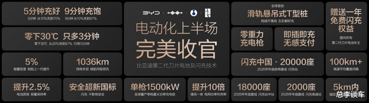 2025年全年,比亚迪累计销量突破460万辆,斩获中国汽车市场车企销量冠军;海外销量突破104万辆,出海足迹覆盖全球119个国家和地区,在多国新能源汽车市场位居销量榜首。比亚迪长期坚守“技术为王”理念,2025年全年研发投入达634亿元,累计研发投入突破2400亿元。2026年3月,比亚迪发布第二代刀片电池及闪充技术,一举攻克了电动化上半场“充电慢”和“低温充电难”的世界性难题,电动化上半场至此完美收官。同时,比亚迪发布“闪充中国”战略,年底将在全国建设20000座闪充站,让用户充电更自由、更便捷,引领电动车进入闪充时代。