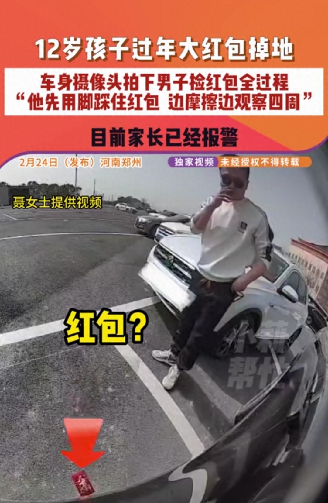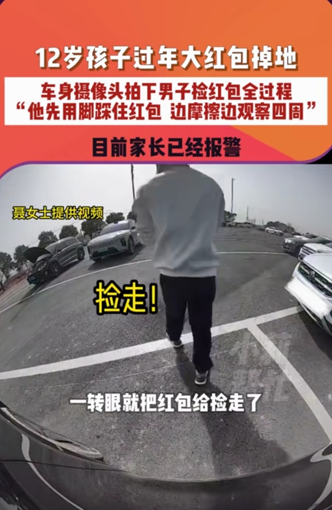 一个12岁孩子过年攒的1255元压岁钱不慎掉落,一名路过的男子没有提醒,没有等待,而是先用脚精准踩住红包,一边用鞋底摩擦,一边警惕地环顾四周,确认无人注意后,才弯腰将红包揣进自己口袋。