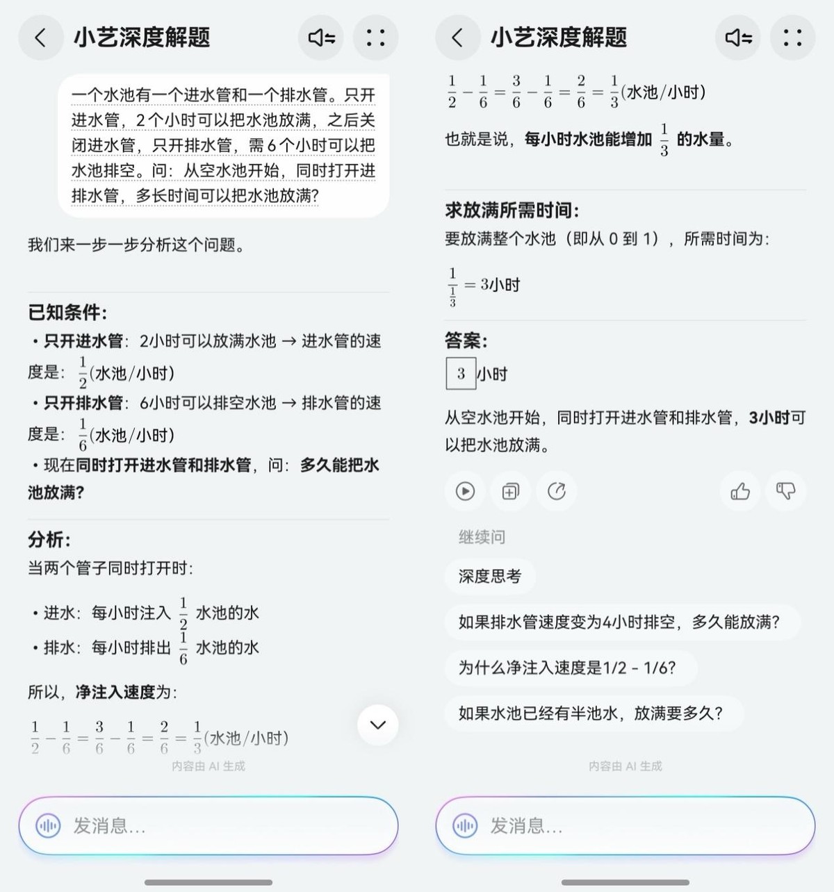 按照博主分享的方法,我赶紧唤醒小艺,打开小艺深度解题智能体,对着手机念出了那道“世纪难题”。没想到,小艺一步一步拆解思路:“我们先看已知条件……计算净注入速度……”逻辑清清楚楚,用这个思路跟孩子讲,他很快就懂了。这下好了,再遇到我讲不明白的题,直接找小艺就行,我也不用再着急上火了!