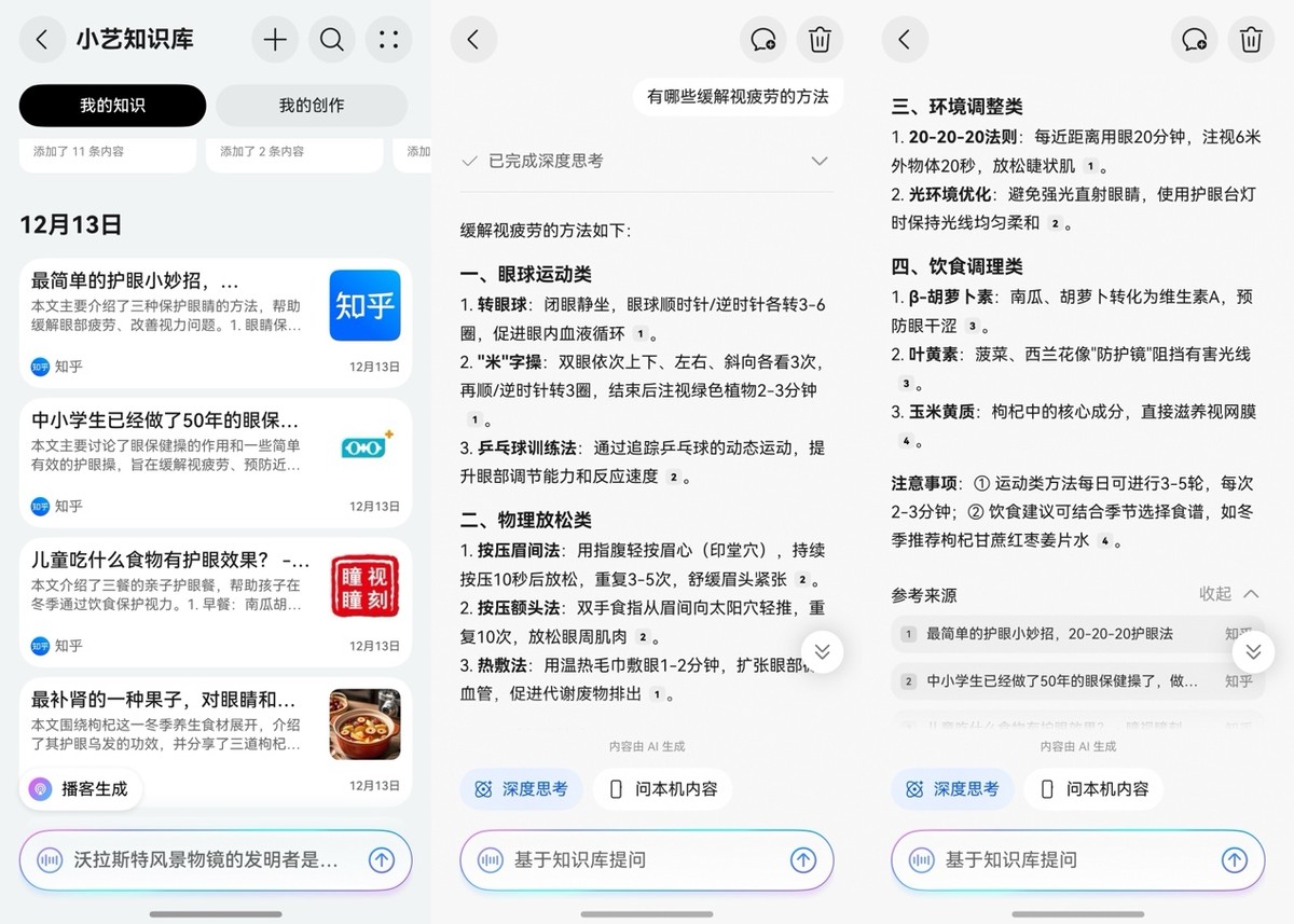 有博主还分享了,可以把小艺知识库当成家庭备忘录,这个实用功能特别戳中我。我把平时收藏的护眼食谱、育儿文章都存进去。最近孩子老说眼睛酸,我就直接问小艺:“有哪些缓解视疲劳的方法?”TA马上就把要点总结出来,而且从眼球运动、物理放松、环境调整、饮食调理等多方面都给出了答案,而且还能生成互动播客。这种“随问随答”的陪伴感,真的让焦虑的育儿日常多了一点安心。