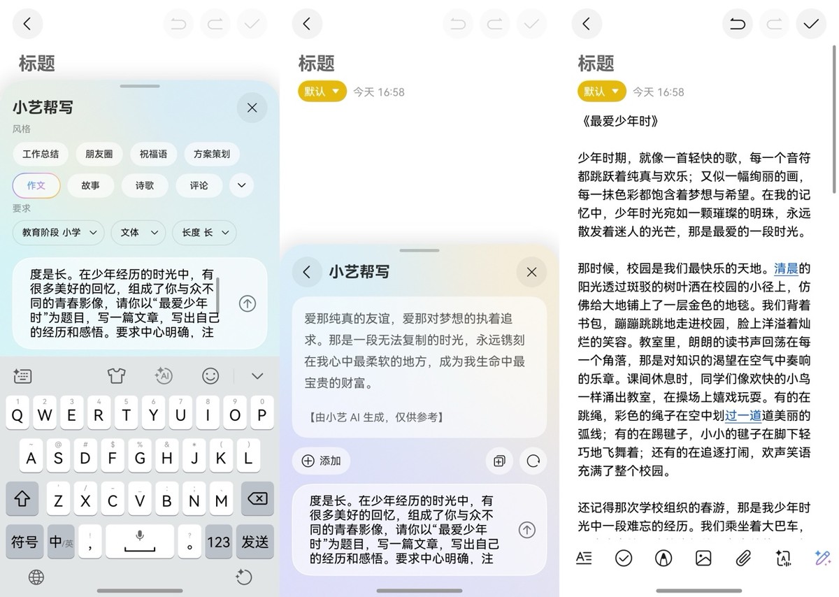 比数学题更让我头疼的是辅导作文。孩子写《最爱少年时》,翻来覆去就是写不出感悟,只有平铺直叙。我试着打开小艺输入法里面的帮写功能,输入作文题目后,它竟然给出了几句十分优美,还符合孩子年龄的表达句子。当然,我不是让它代写,而是把它当成了一个提供词汇和灵感的工具库,让孩子从中获得新的词汇和表达角度,慢慢找到自己的写作思路。