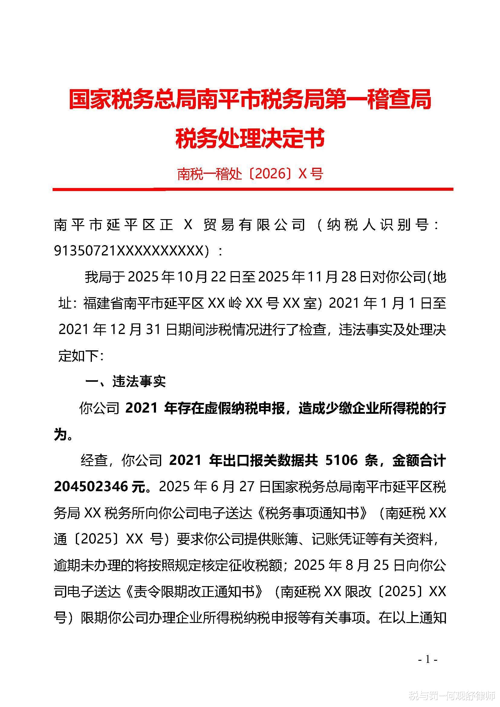 通过检索,笔者找到了2024年税务部门对该贸易公司作出的《税务处理决定书》(南税一稽处〔2024〕XXX号)。《税务处理决定书》载明,税务部门于2024年5月24日至2024年6月14日对该贸易公司的涉税情况进行检查,而《税务处理决定书》是2024年6月14日作出的。