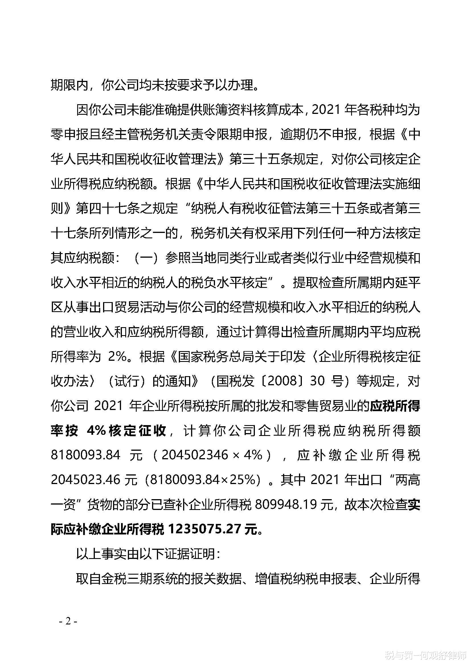 根据《国家税务总局关于印发〈企业所得税核定征收办法〉(试行)的通知》(国税发〔2008〕30号)等规定,对你公司2021年企业所得税按所属的批发和零售贸易业的应税所得率按4%核定征收,计算你公司企业所得税应纳税所得额8180093.84元(204502346×4%),应补缴企业所得税2045023.46元(8180093.84×25%)。其中2021年出口“两高一资”货物的部分已查补企业所得税809948.19元,故本次检查实际应补缴企业所得税1235075.27元。