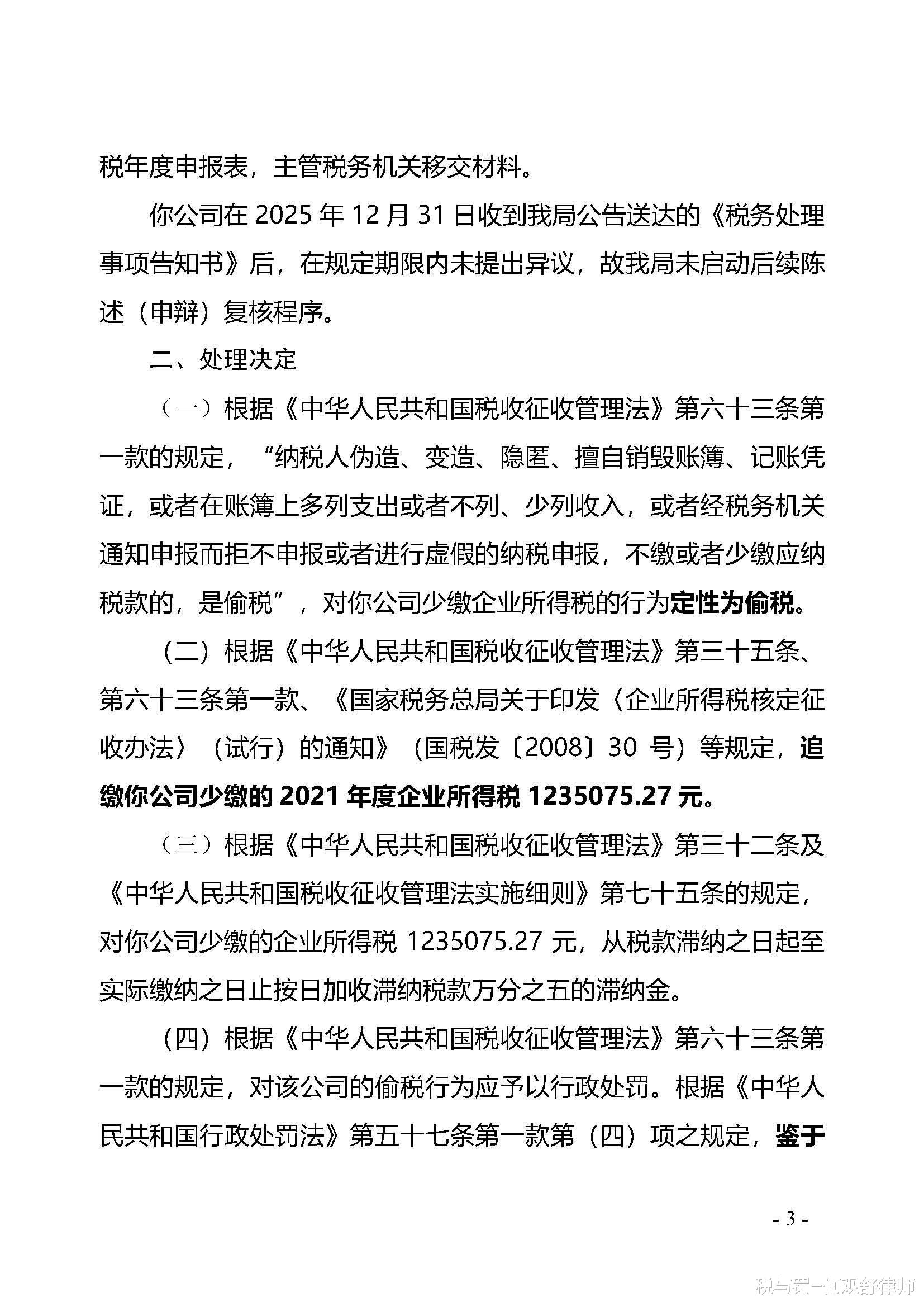 (二)根据《中华人民共和国税收征收管理法》第三十五条、第六十三条第一款、《国家税务总局关于印发〈企业所得税核定征收办法〉(试行)的通知》(国税发〔2008〕30号)等规定,追缴你公司少缴的2021年度企业所得税1235075.27元。