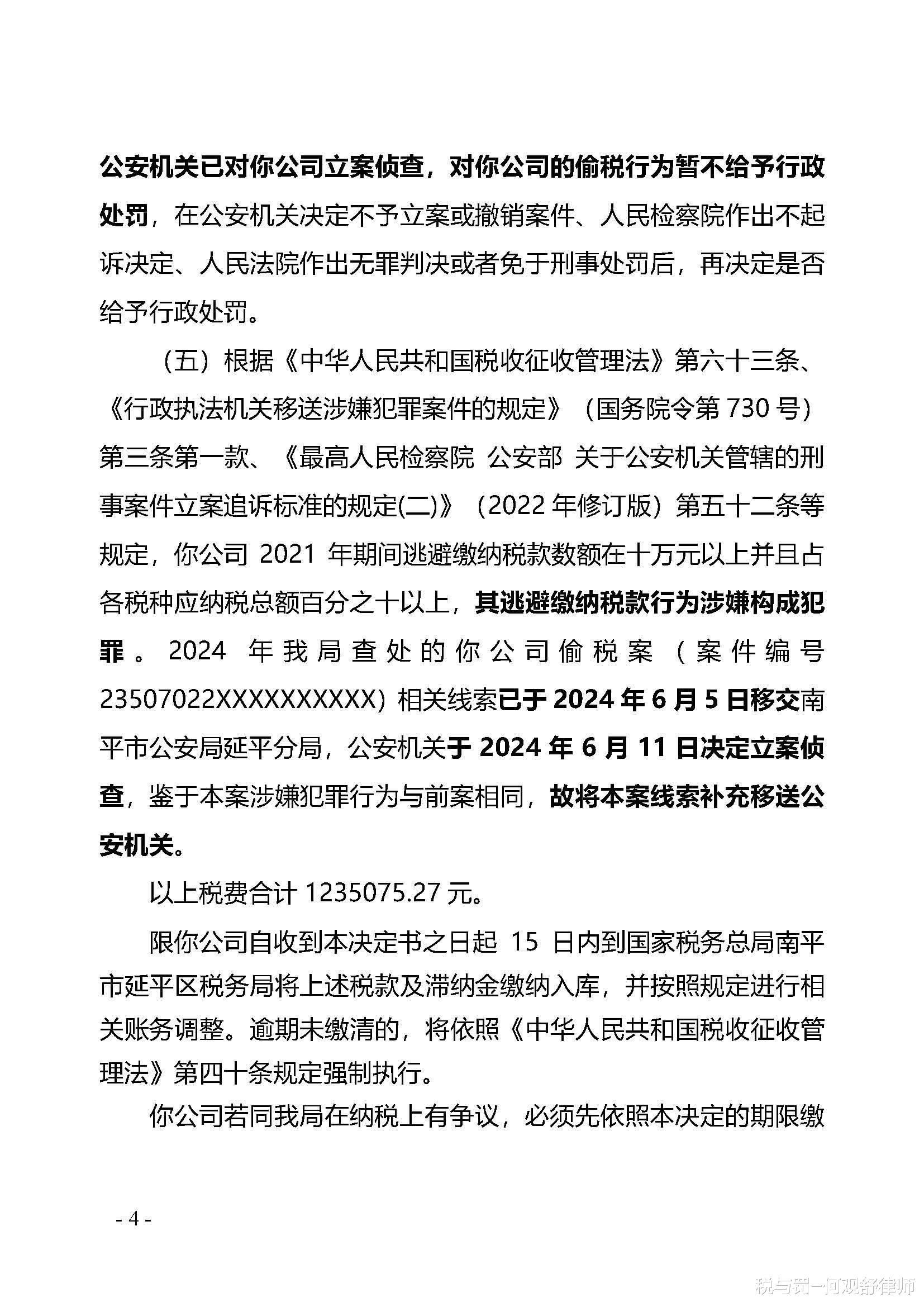 (五)根据《中华人民共和国税收征收管理法》第六十三条、《行政执法机关移送涉嫌犯罪案件的规定》(国务院令第730号)第三条第一款、《最高人民检察院 公安部 关于公安机关管辖的刑事案件立案追诉标准的规定(二)》(2022年修订版)第五十二条等规定,你公司2021年期间逃避缴纳税款数额在十万元以上并且占各税种应纳税总额百分之十以上,其逃避缴纳税款行为涉嫌构成犯罪。2024年我局查处的你公司偷税案(案件编号23507022XXXXXXXXXX)相关线索已于2024年6月5日移交南平市公安局延平分局,公安机关于2024年6月11日决定立案侦查,鉴于本案涉嫌犯罪行为与前案相同,故将本案线索补充移送公安机关。