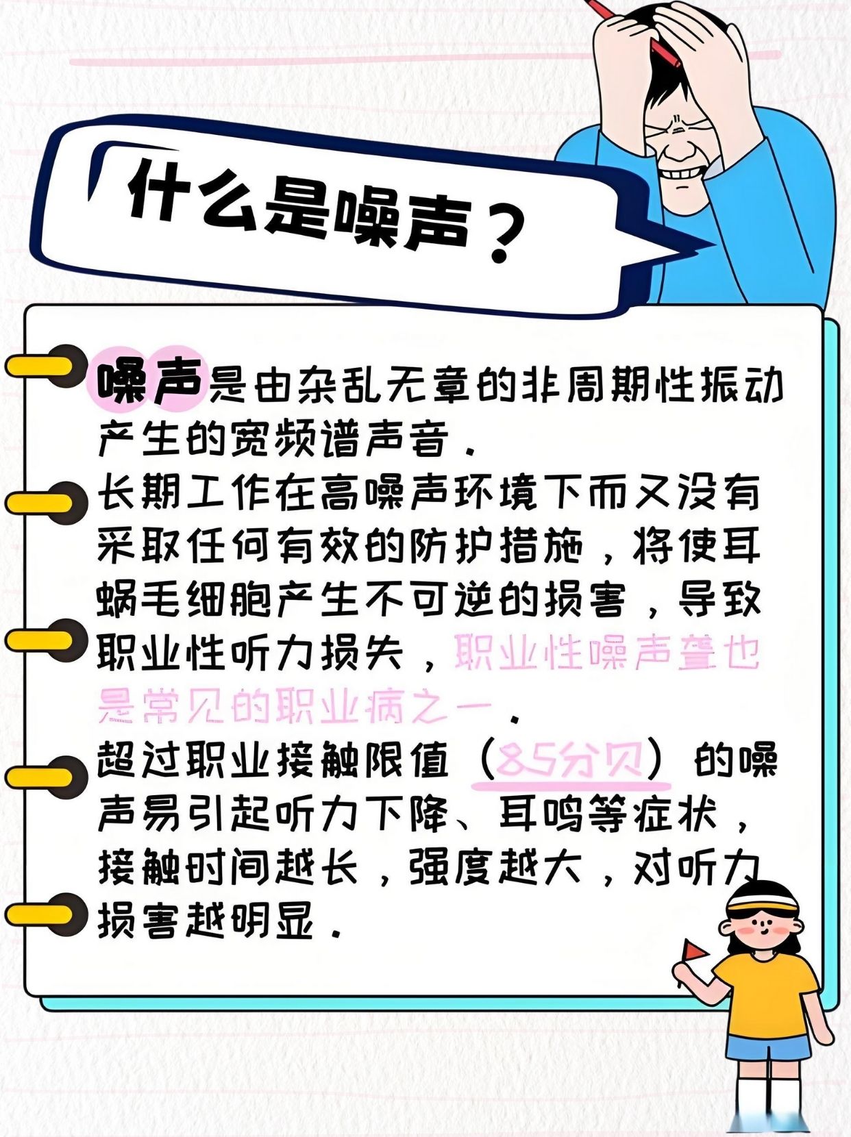 它主要来自各类生产设备运转、工具使用,持续刺激耳朵,损伤听觉细胞。长期暴露,听力会慢慢下降,甚至致聋😱。保护听力,记得戴耳塞、耳罩,定期做听力检查!