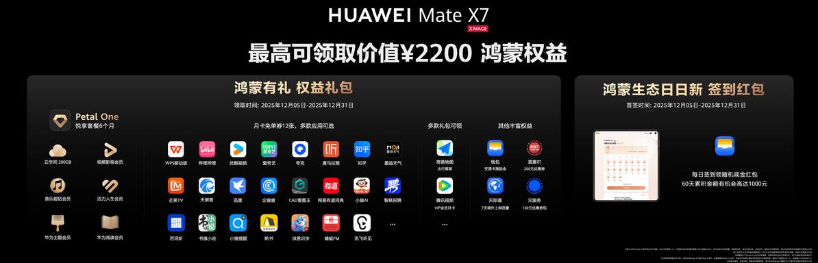 12月5日10:08,华为Mate X7已火爆开售。为回馈广大用户,华为还同步推出了 “鸿蒙有礼”专属活动——即日起至2025年12月31日,购机用户可领取最高价值2200元的“鸿蒙有礼”权益礼包(覆盖影音、出行、办公等多场景)+“鸿蒙生态日日新”签到红包。机会难得,不要错过。