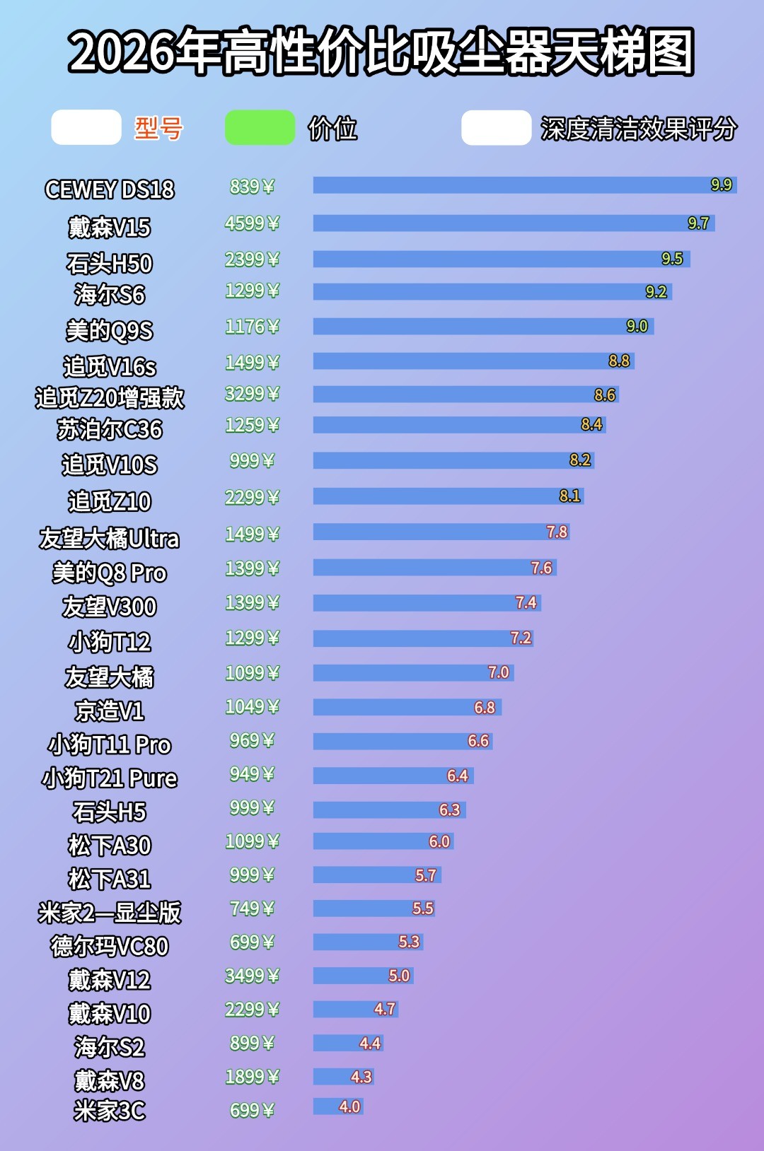 吸尘器十大品牌什么牌子吸力大性价比高?根据上面提到的吸尘器清洁性能和使用体验方面的选购要点,相信大家对自己心中满意的机型也有了大致的方向,以下这份排行榜清单是我基于实测表现和用户长期反馈两方面综合考虑后整体出来的,可以更直观地看出各机型的差异,快速选出靠谱的机型:
