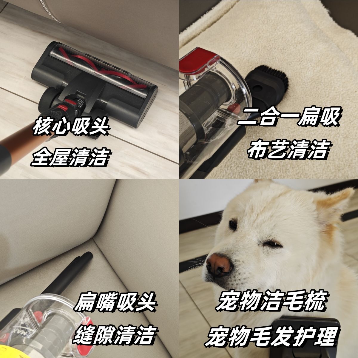 吸尘器十大品牌什么牌子吸力大性价比高?建议集中精简为3-4个实用刷头。常用的两个,地面主地刷和扁吸/缝隙吸头一个用于日常地板、瓷砖、硬质地面,另一个用于家具底下、沙发缝、床边。如果家里有地毯或者宠物的,建议再加软刷/布艺刷头和宠物洁毛刷,一个用于沙发床铺、窗帘、布艺家具,另一个给宠物梳毛、吸浮毛。