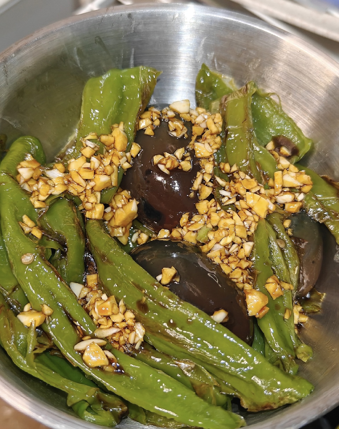 首先,把青椒洗净,去掉辣椒蒂。不需要放油,直接把锅烧得冒烟,将青椒整根放进去,用锅铲不停地按压、翻滚。你会听到“滋滋”的声音,那是辣椒在释放它的香气。一直煸到青椒表面起皱,呈现出焦黑的“虎皮”状,这时候的辣椒香气最浓郁。煸好后,把青椒装进保鲜袋里焖个几分钟,这样焦皮更容易撕掉。然后撕掉焦皮,把青椒撕成条状备用。这一步千万别偷懒用刀切,手撕的断面不规则,才更容易吸收酱汁,口感也更有嚼劲。
