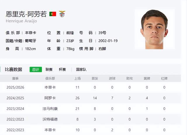 言归正传,离队第一人,23岁的葡萄牙前锋亨里克·阿劳若(Henrique Araújo)。穆里尼奥已经在物色新前锋了,风格要跟队里现有的两位不同。意思就是不但能和希腊凯恩、克罗地亚大伊万互补,还要在对方被豪门选妃后,能迅速的挑起大梁。而阿劳若蒲柳之姿,上限金丹,显然不够看啊!所以这位本菲卡根正苗红的青训球员,在穆里尼奥手下仅出场五次,其中四次是在比赛接近尾声时替补登场,然后就成为匆匆的过客,自生自灭。