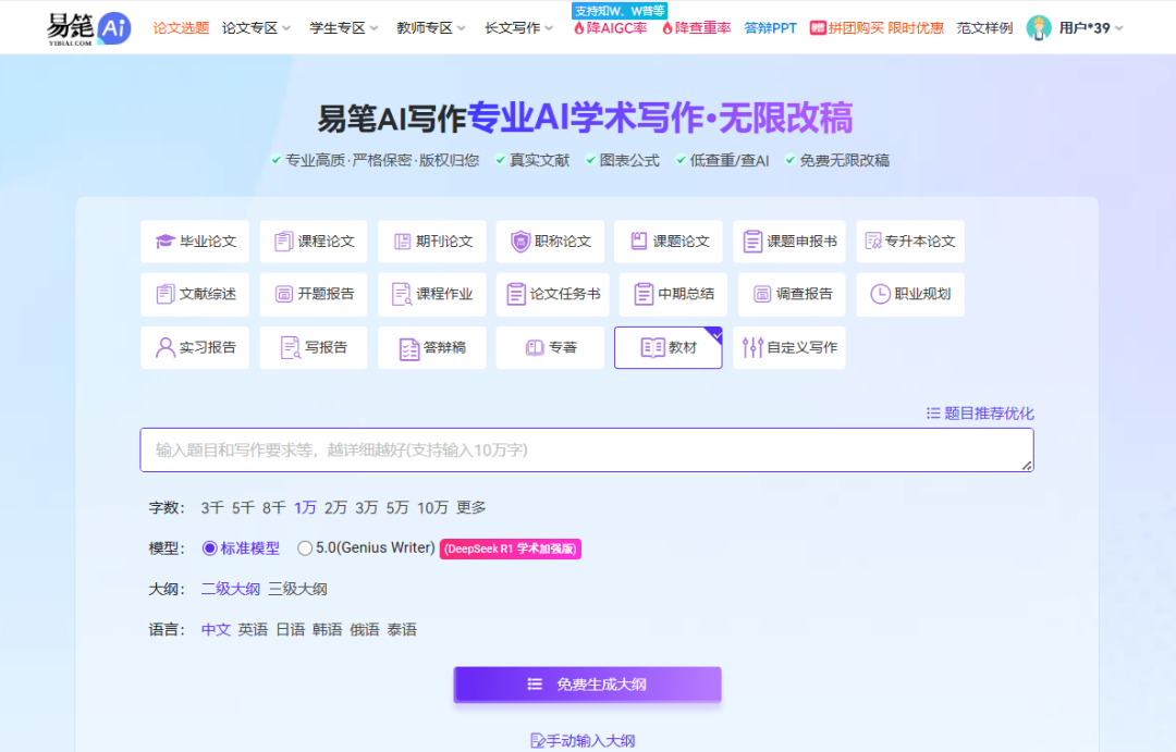 只需输入标题,AI一键生成高质量、低查重的万字教材、专著初稿