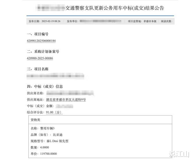在全国多地政府的实际采购中,比亚迪已成为警车队伍中的“高频面孔”。公开的政府采购公告显示,安徽合肥、辽宁锦州、陕西西安、湖北孝感,再到贵州黔南,多地公安系统的警车采购项目中都出现了比亚迪旗下车型的身影。这些车型覆盖了秦PLUS、宋Pro、宋PLUS等多款主力产品,应用于日常巡逻、刑事侦查等多种执法执勤场景。