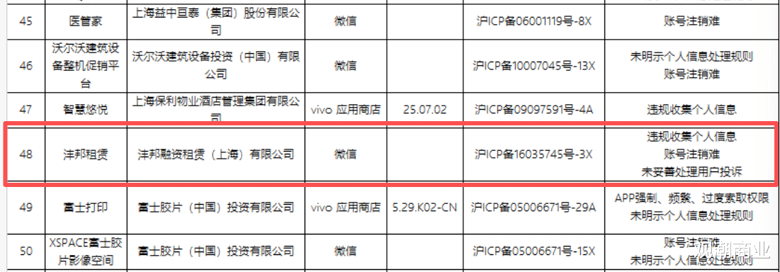 实际上,这并非沣邦融资租赁首次因个人信息和用户权益问题被监管点名。今年8月5日,沣邦租赁APP就曾因“未明示个人信息处理规则”被上海通信管理局通报。