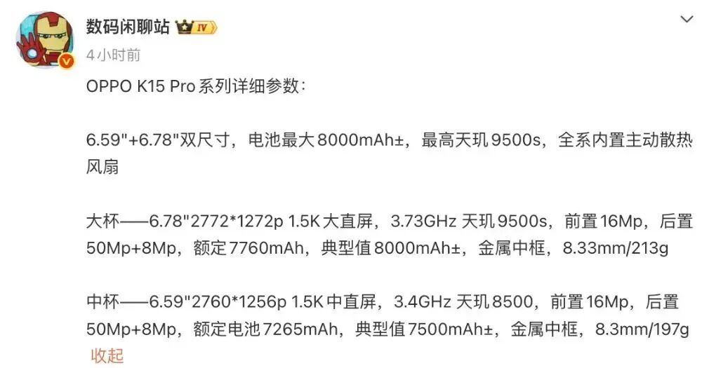 在此之前,博主@数码闲聊站 的一份爆料中提到了OPPO K15 Pro系列的详细参数。