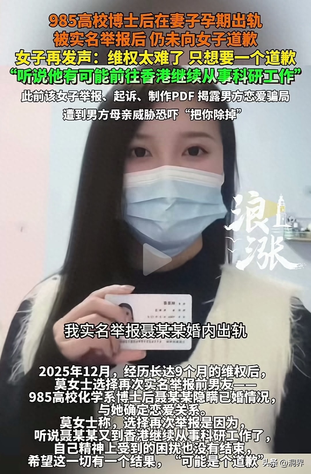 近日,北京工作的莫女士手持身份证,网上实名举报清华博士男友婚内出轨,还被其母亲人身威胁。