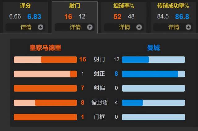 此役,皇马1-2曼城,看似小负,其实是完败!为什么这么说呢?虽然皇马控球率52%略占上风,获得了16次射门,但仅有1次射正;反观曼城,一共有12次射门,但有8次射正,足足是皇马的8倍,你都无法射正还进啥球呢?看来皇马没有姆巴佩显得更差劲。曼城真是罗德里戈贵客,此役这位巴西前锋打破了32场进球荒,罗德里戈踢曼城就有好的发挥,此役他获得全场最高的8.1分,也是此役两队唯一的8+评分。