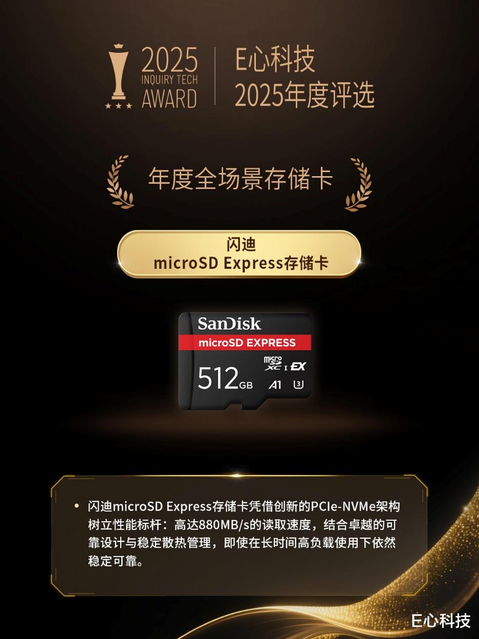 在本次E心科技2025年度评选中,闪迪microSD Express存储卡被评为“年度全场景存储卡”。