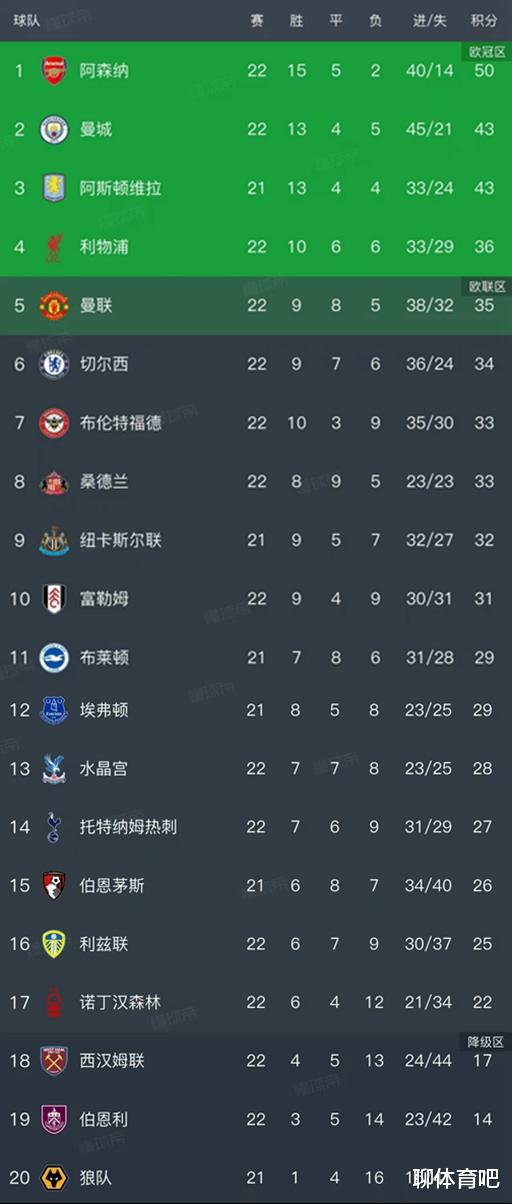英超第22轮结束了7场比赛,最新积分榜如下!