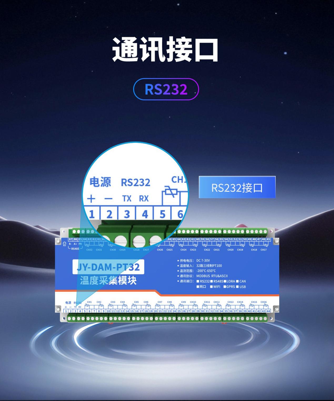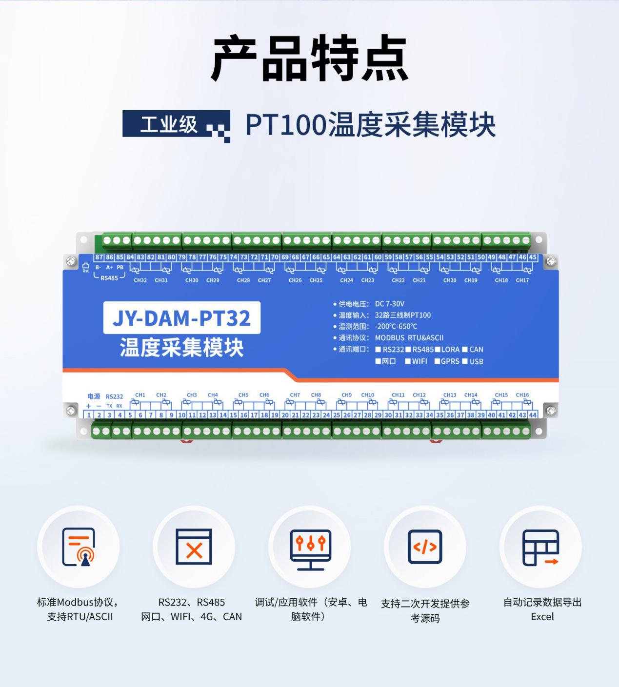 32路PT100温度采集模块是一款工业级数据采集设备,核心功能是同时采集32路PT100铂电阻传感器的温度信号,并将其转换为数字信号或标准工业信号,以便上传至PLC、工控机、物联网平台等系统,实现多点温度的实时监测、数据记录与智能控制。